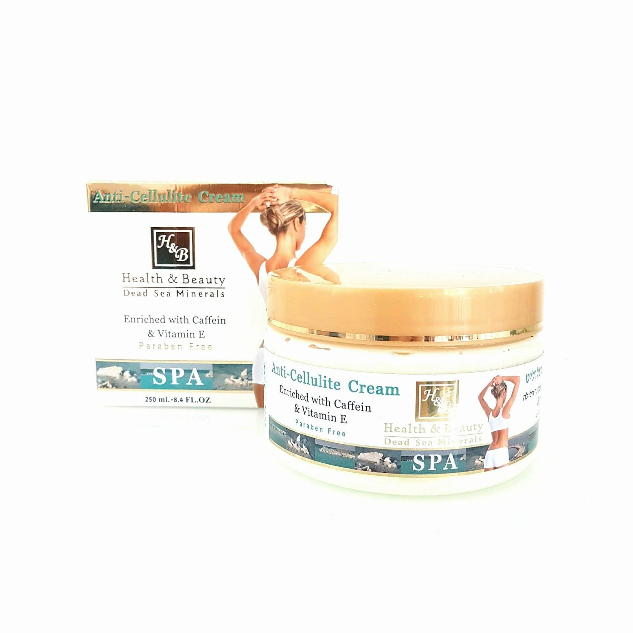 H B, Health and Beauty - Anti-Cellulite Cream with Caffeine Ingredients: Rich in active plant extracts and vitamin E. It uses an antioxidant, caffeine, known for its anti-cellulite properties. It contains horse chestnut extract, a cosmetic active ingredient that improves skin firmness. Using this anti-cellulite cream softens the skin and refines its texture. It is enriched with Dead Sea minerals and avocado oil, which penetrates the deeper layers of the skin. Chamomile and aloe vera extracts moisturize and soothe the skin. Cocoa butter and evening primrose oil rejuvenate the skin and accelerate the activity of the other ingredients. Use: After bathing, Rub onto areas affected by cellulite – thighs, stomach, and buttocks. For optimal results, we recommend rubbing with a shower sponge and using the cream daily. We also advise using a body scrub at least once a week. Contents: 250mlCellulite treatment. Anti-orange peel skin. Circulatory. Draining.H B, Health and beauty - Crème Anti- Cellulite à la cafeine Ingrédients? :? riche en extraits actifs de plantes et en vitamine E? ? Elle utilise un antioxydant, la caféine, connu pour ses propriétés anti-cellulite? ? Elle contient de l'extrait de marronnier qui est un ingrédient actif cosmétique ?améliorant la fermeté cutanée?.? L'utilisation de cette crème anti-cellulite adoucit la peau et affine le grain et est ?enrichi avec des minéraux de la mer morte et de l'huile d'avocat qui pénètre ?dans les couches profondes de la peau?.? L'extrait de camomille et d'aloe vera - qui hydratent et apaisent la peau Le beurre de cacao et l'huile d'onagre - qui rajeunit la peau et permet ?d'accélérer l'activité des autres ingrédients ? ? Utilisation: ? Après le bain, frottez sur les zones cellulitiques - cuisses, le ventre et les fesses. Pour ?des résultats optimaux, nous vous recommandons de frotter avec une éponge de ?douche et d'utiliser la crème quotidiennement. Nous vous conseillons d'utiliser ?également un peeling corporel au moins une fois par semaine. Contenu: 250mlTraitement cellulite. Anti peau d'orange. Circulatoire. Drainante.H B Crème Anti-Cellulite 250 ml