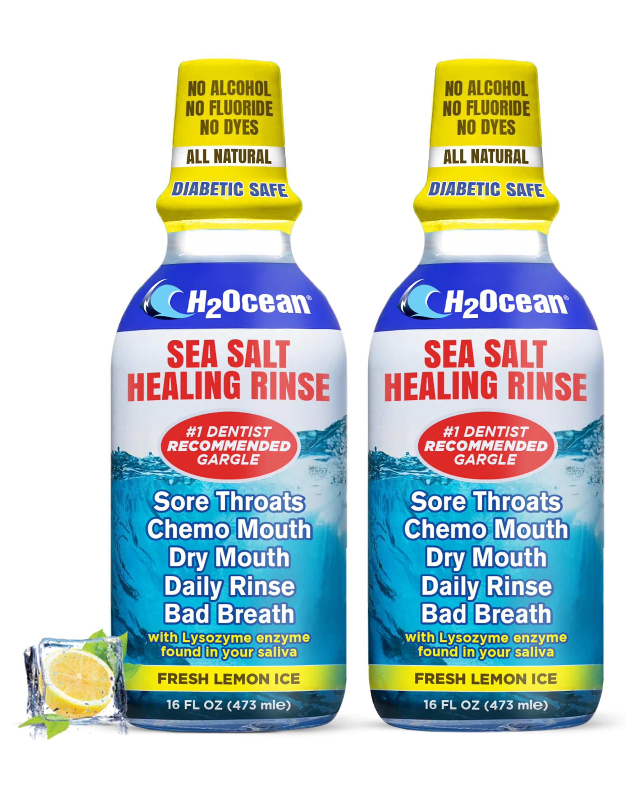 H2Ocean Healing Rinse Natural Sea Salt - Mouth Rinse for Oral Care & Tonsil Stones - Great for Piercings Sore Throats & Gum Health - Alcohol- & Fluoride-Free Mouthwash - Lemon Ice 16 oz (Pack of 2)