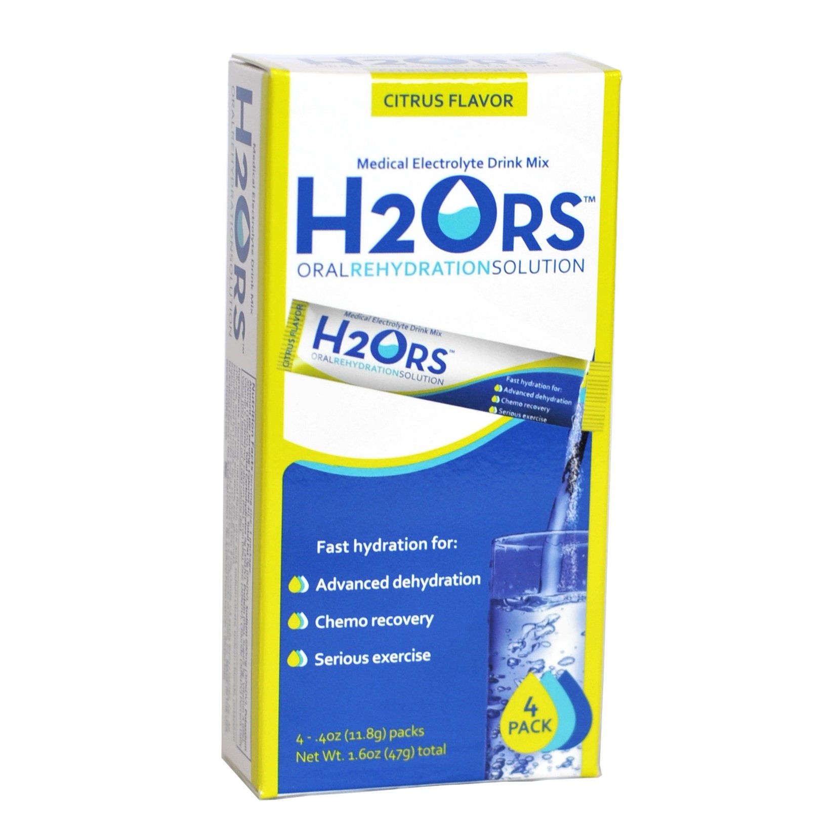 About H2ORS is a medically formulated electrolyte drink powder that is an alternative to IV therapy for mild moderate non-acute dehydration due to medical treatments, serious exercise, and illness. Serious Medical Roots The World Health Organization (WHO) and Unicef originally created Oral Rehydration Solution (ORS) decades ago to treat dehydration in crisis situations, and they still use it worldwide to save millions of lives each year. H2ORS is the only commercially available ORS that meets and improves upon all WHO criteria for an ORS. Science H2ORS contains the very precise ratio of sodium, glucose, and other key electrolytes determined by the WHO to activate the Sodium Glucose Co-transport system in the small intestine. This means that water and the electrolytes in H2ORS are absorbed very rapidly into the vascular system without having to travel through the entire digestive tract. Directions -Mix 1 pack with 500ml (16.9oz) water -Adults: Drink up to 2 servings per hour -Children: Drink up to 1 serving per hour Ingredients H2ORS includes the precise and optimal amounts of each ingredient as specified by the WHO plus flavoring and natural color: dextrose, natural flavor, citric acid, sodium citrate, sodium chloride, potassium chloride, ascorbic acid, sucralose, zinc gluconate. 40 Calories serving. Safety If on low sodium diet, have kidney, liver, or heart troubles, seek physician guidance before use. Keep out of reach of children. Not advised for infants under 12 months.