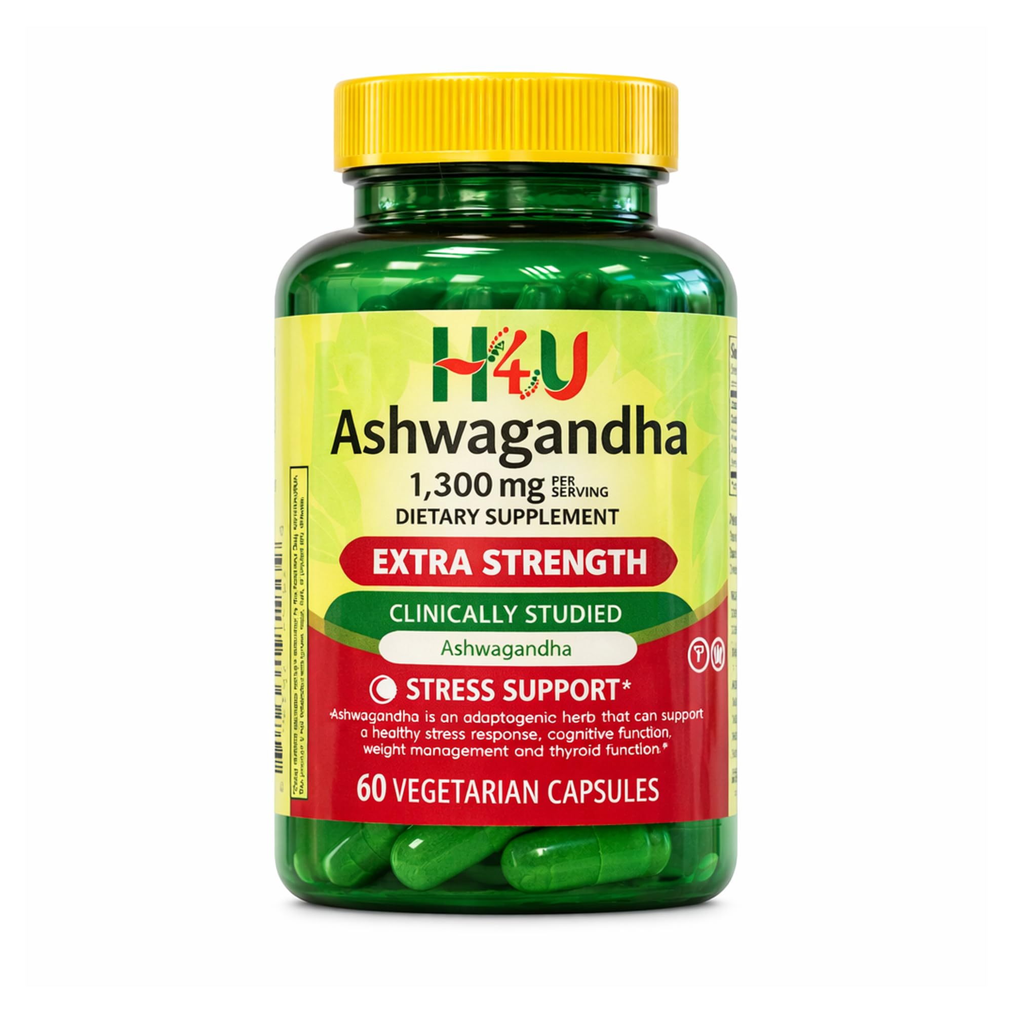 Less than 5mg sodium per serving, Non-GMO Project verified. 60 vegetarian capsules. No gluten, yeast, wheat, milk or milk derivatives, lactose, sugar, soy, artificial color, or artificial flavor. All H4U products are manufactured in a state-of-the-art facility that is free from allergens, ensuring the highest quality possible. 1300 MG Ashwagandha Capsules offer a variety of health benefits. These capsules contain 1300 mg of 1300 MG Ashwagandha Capsules provide a range of health benefits. Each capsule contains 1300 mg of Ashwagandha, a highly bioavailable, full-spectrum extract derived from the herb's root. This product emphasizes a holistic approach to overall well-being. Research indicates that 1300 MG Ashwagandha can help reduce stress, promote relaxation, improve sleep quality, and enhance overall quality of life, among other advantages. A Higher Standard: We take pride in providing you with pure ashwagandha that does NOT CONTAIN fillers such as magnesium stearate, dioxides, gluten, soy, sugar, yeast, or starch. Supports Stress Relief, Mood Enhancement, and Hormonal Balance – Ashwagandha is a potent adaptogen that has been traditionally used in Ayurvedic medicine to help the body manage stress, promote a calm and balanced mood, and maintain healthy cortisol levels. It is also commonly used to support focus, thyroid function, and adrenal health in both men and women. Easy Daily Supplement – No mixing or measuring. Simple capsule format for consistent daily use at home or on the go. Clean, Plant-Based Formula – Free of gluten, soy, sugar, yeast, dairy, and artificial additives. Suitable for vegetarians. Stress Relief Mood Enhancement – Adaptogenic support to help the body manage daily stress, promote relaxation, and support overall mental well-being. Ashwagandha Capsules for Daily Stress Support – Convenient vegetarian capsules containing high-quality ashwagandha extract and powder to support calm mood and emotional balance.