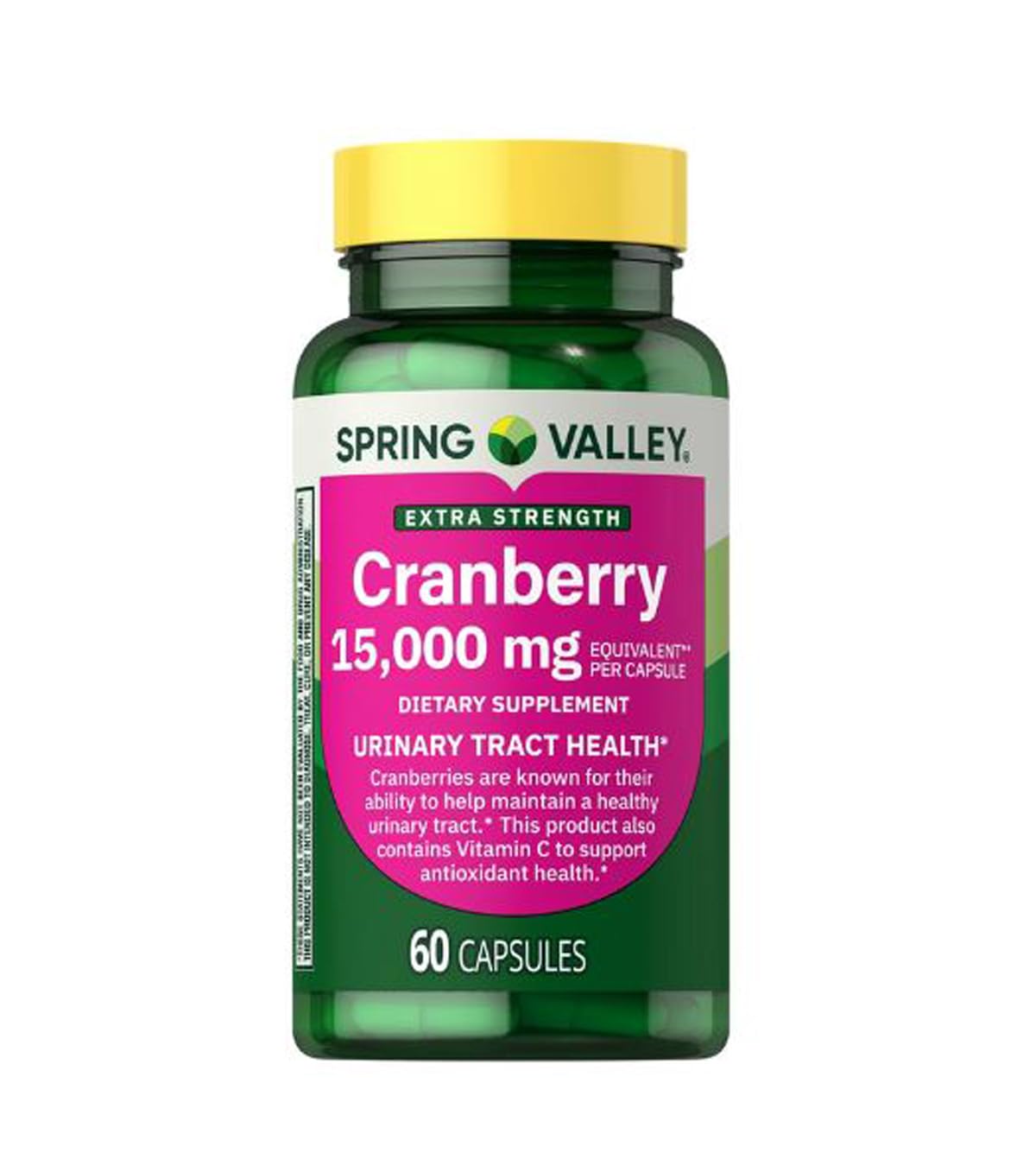 Bottle of 60 capsules. No artificial colors, sweeteners, or preservatives. No gluten, dairy, peanuts, and soy. Contains vitamin C to support antioxidant health. Contains 300mg cranberry concentrate per capsule, a 50:1 concentrate equivalent to 15,000mg fresh cranberries. Supports urinary tract health . Spring Valley Extra Strength Cranberry Dietary Supplement Capsules, 15,000mg Equivalent, 60 Count.