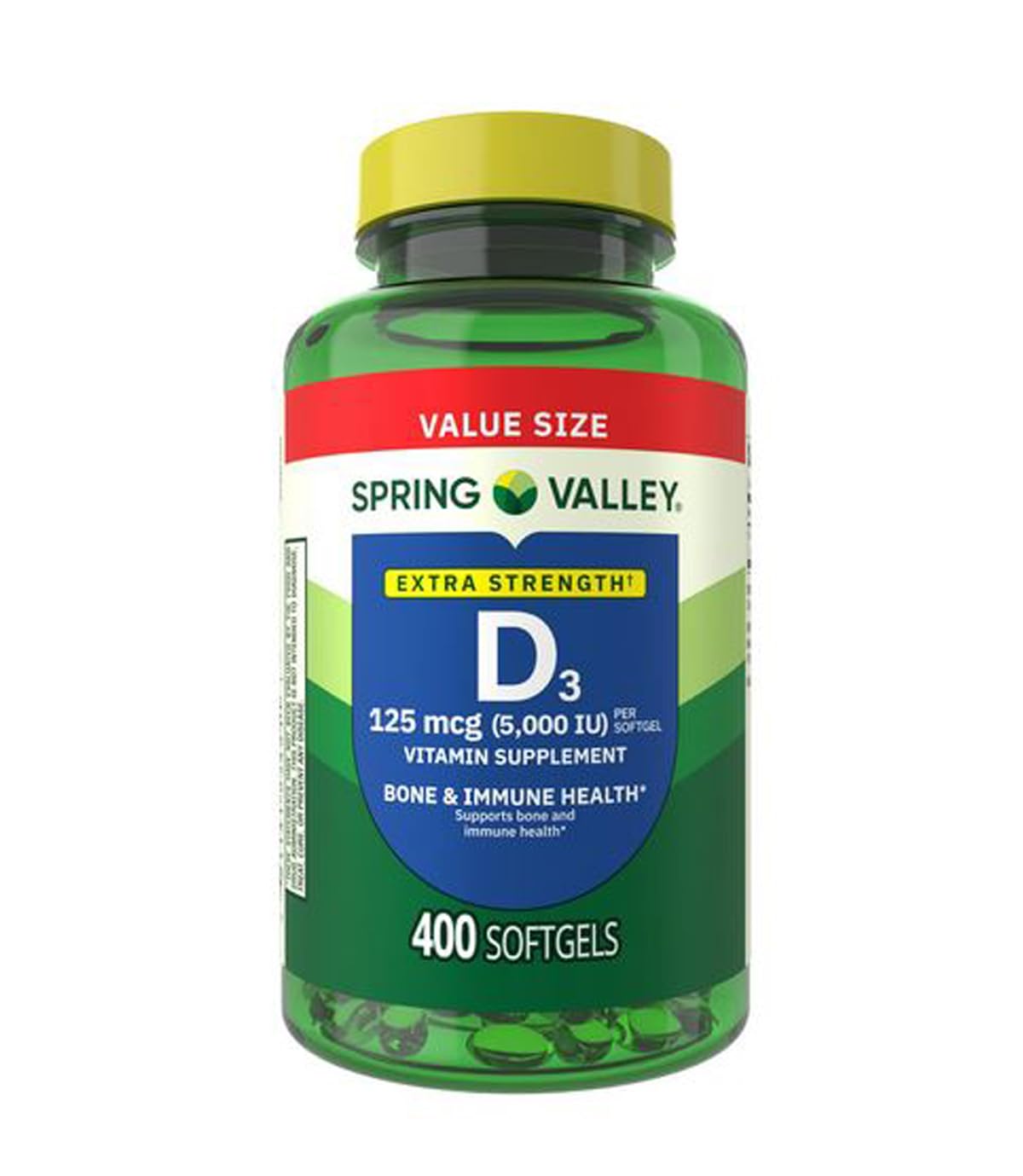 400 softgels per bottle. Small, smooth, and easy-to-swallow softgels. Essential for proper calcium absorption and supports bone and immune health . Bone and immune health dietary supplement. Spring Valley Extra Strength Vitamin D3 Supplement Softgels for Bone and Immune Health, 125 mcg (5000 IU), 400 Count.