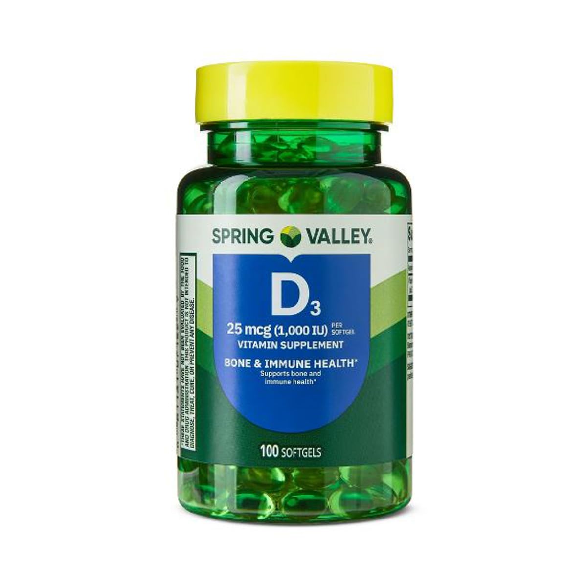 100 softgels per bottle. No gluten, yeast, wheat, milk or milk derivatives, lactose, sugar, artificial color, artificial flavor, or sodium (less than 5 mg per serving). Small, smooth, and easy-to-swallow softgels. Essential for proper calcium absorption and supports bone and immune health . Bone and immune health dietary supplement. Spring Valley Vitamin D3 Supplement Softgels for Bone and Immune Health, 25 mcg (1,000 IU), 100 Count.