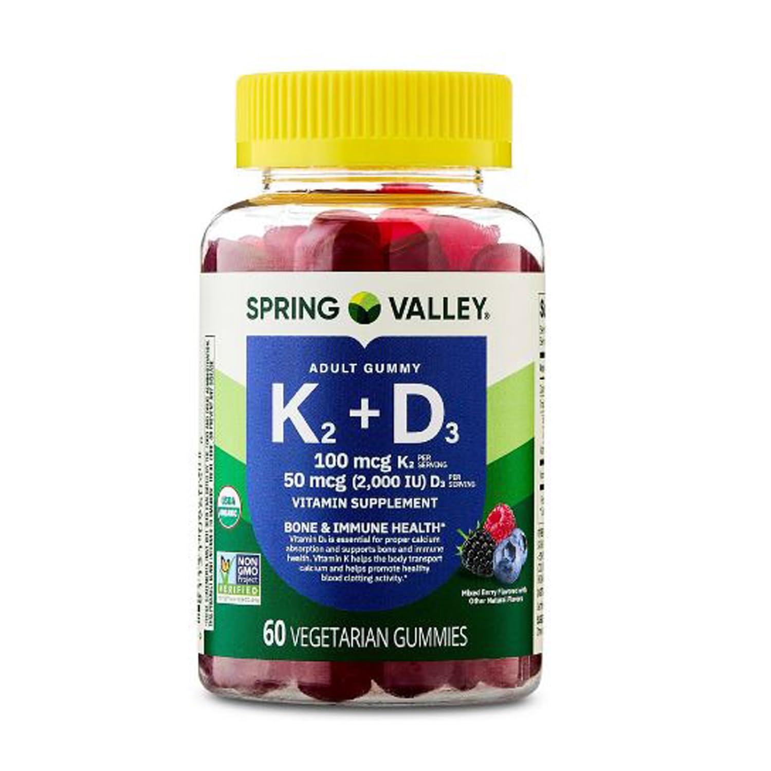 Fosters optimal calcium absorption and healthy blood clotting . Formulated to fit the needs of individuals of any gender. Free from GMOs. 60-count pack of Spring Valley vegetarian-friendly gummies in mixed berry flavor. Each serving includes 100 mcg Vitamin K2 and 2000 IU Vitamin D3. Blend of Vitamin K2 and D3 to support bone and immune function . Spring Valley Vitamin K2 Vitamin D3 Supplement Vegetarian Gummies for Bone and Immune Health, Mixed Berry, 60 Count.