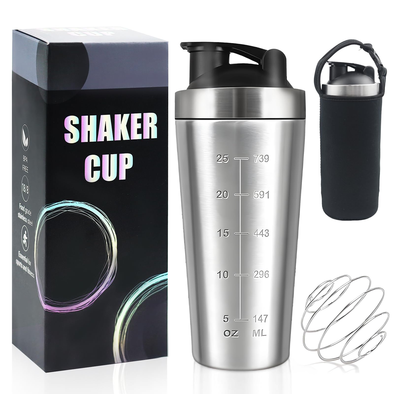 Widely applicable to a variety of drinks: This shaker is suitable for mixing hot and cold beverages such as protein shakes, fitness supplement drinks, meal replacement shakes, and more. If you're looking for a durable stainless steel shaker to replace plastic styles, this is a reliable choice. Leak-proof and evenly mixed: This shaker features a stainless steel mixing ball that effectively dissolves powder, allowing protein powders and meal replacements to blend quickly for a smooth and creamy taste. This shaker is easy to hold for both adults and children. Portable design and easy cleaning: This shaker comes with a removable carrying case for convenient transport, ideal for fitness, hiking, camping, and more. The case is heat-resistant and comfortable to hold. The shaker body is easy to clean thoroughly. Large 750ml capacity with graduations: This shaker holds 750ml, meeting most beverage preparation needs. Clear graduations inside and out make it easy to measure volume and mix precisely, making it ideal for exercise and everyday use. High-quality stainless steel: This shaker is made of 304 stainless steel with BPA-free PP accessories, ensuring durability and safety. Unlike ordinary plastic containers, the stainless steel interior is odor-resistant, providing a cleaner and safer experience, making it an ideal companion for fitness and exercise.