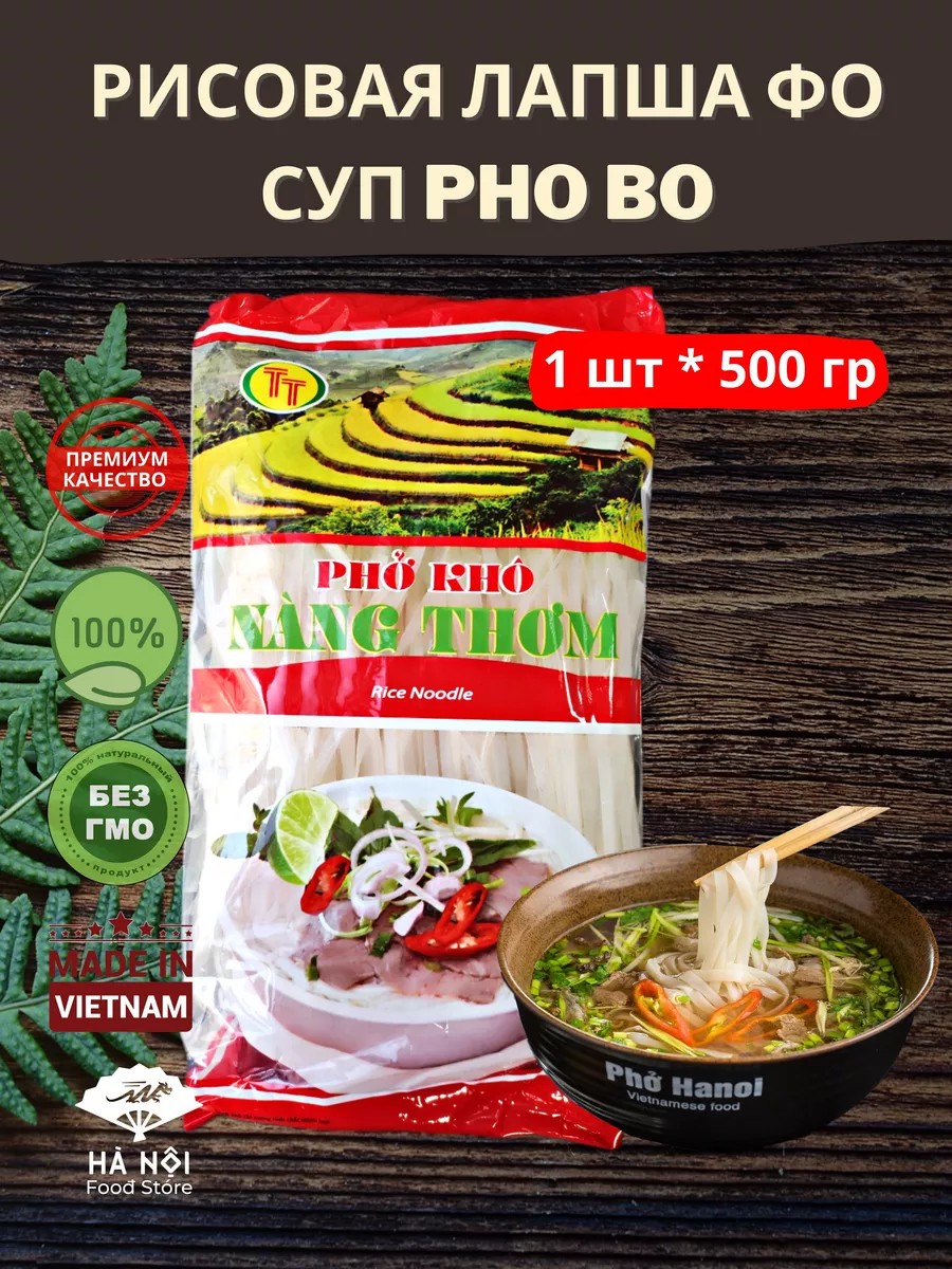 Рисовая лапша - основа большинства блюд кухни стран Юго-Восточной Азии. Вам знакомо такое блюдо, как фо бо? Это коронное блюдо вьетнамской кухни: говяжий бульон с мясом (курица или говядина), зеленью и рисовой лапшой. Эта рисовая лапша идеальна для приготовления настоящего вьетнамского фо бо, как его готовят в лучших кафе Ханоя. Это также отличный альтернативный вариант гарнира вместо привычной яичной лапши, макарон или круп. С рисовой лапшой можно приготовить как суп, так и второе блюдо - тайская лапша пад тай, лапша ВОК тоже готовятся на основе рисовой лапши с добавлением соусов, мяса, морепродуктов и овощей. В чем же преимущество рисовой лапши перед другими гарнирами? Состав: рисовая мука и вода, прекрасно подходит для тех, кто не переносит глютен и очень трепетно относится к подбору продуктов для своего рациона Легкость в приготовлении - достаточно лишь отварить ее в кипящей воде в течении 2-3 минут Универсальность - подходит как для супов, так и для вторых блюд Для веганов и вегетарианцев - отличный способ разнообразить свой рацион Натуральная вьетнамская рисовая лапша для настоящих ценителей кухни стран Азии! Рисовые макароны, Bun kho, лапша бун, фо, Pho, Фо Бо, Pho Bo