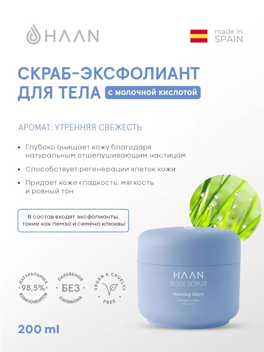 Уход за кожей тела станет расслабляющим ритуалом вместе со скрабом- эксфолиантом HAAN “Утреняя свежесть», а аромат оставит на теле приятный шлейф зеленого чая, цветочной герани и грейпфрута.