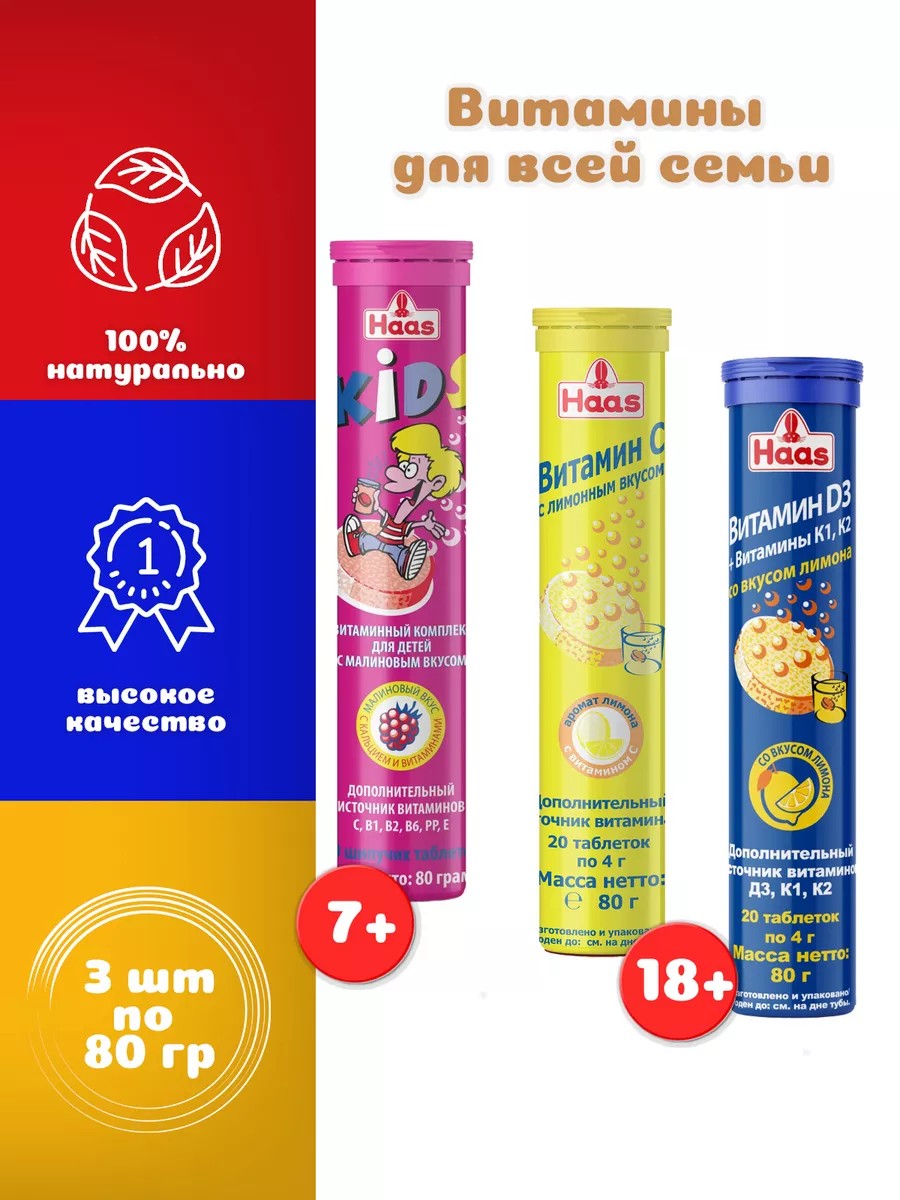 Package ContentsVitamins Vitamin C 80 gr HAAS - 1 pc; Vitamins Vitamin D3 80 gr HAAS - 1 pc; Children's Vitamins 1 pc. 80 g each HAAS