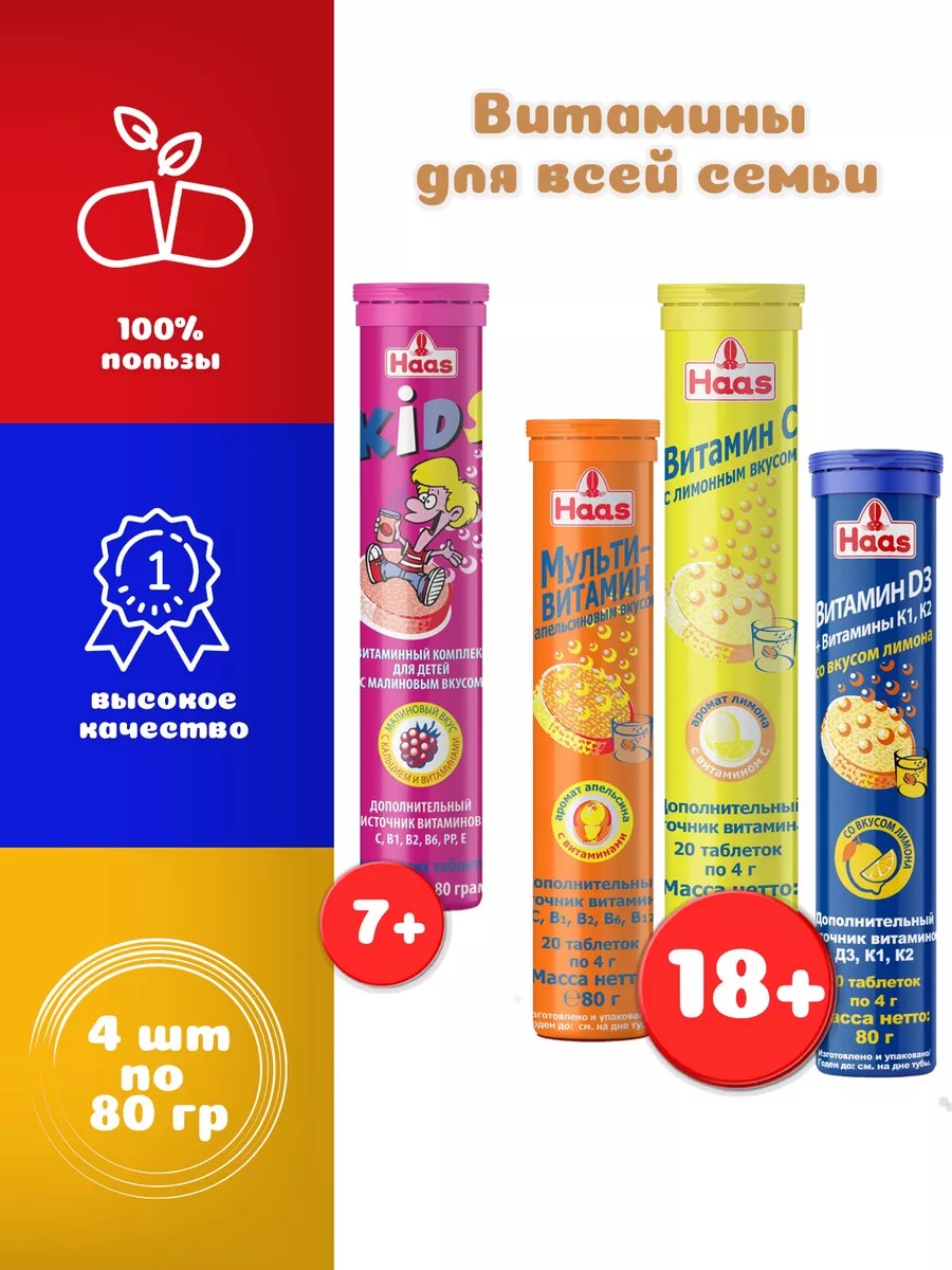 Complete listVitamins Vitamin C 80 g HAAS -1 pc; Vitamins Vitamin D3 80 g HAAS - 1 pc; Vitamins Multivitamin 1 pc. of 80 g HAAS; Children's Vitamins 1 pc. 80 g each HAAS
