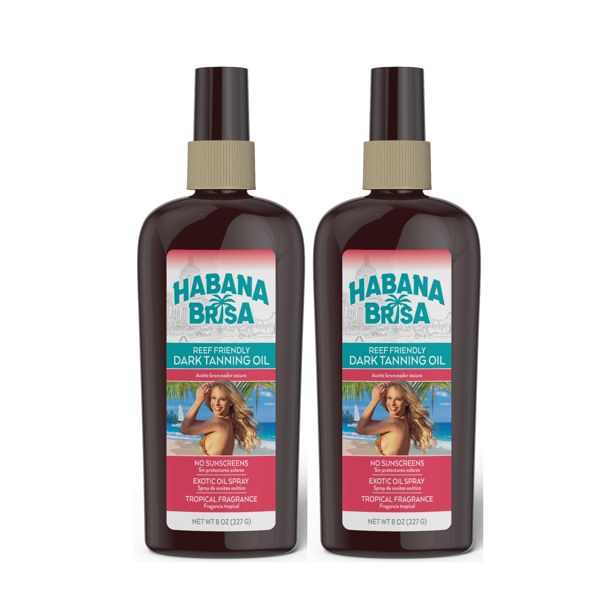Achieve a deep, radiant tan with Habana Brisa Reef-Friendly Mineral Dark Sun Tanning Oil, a premium Ron Rice product. This luxurious dark tanning oil is crafted to enhance your tanning experience while nourishing your skin with a rich blend of natural oils and botanical extracts. Reef-Friendly and Hawaii Act 104 Compliant: Our tanning oil is free from oxybenzone and other harmful chemicals, making it safe for coral reefs and marine life. This dark tan oil aligns with Hawaii's strict environmental standards, ensuring a guilt-free tanning experience. At Habana Brisa, we take pride in crafting our products in small batches to ensure each bottle meets our rigorous standards for quality and effectiveness. This careful, hands-on approach allows us to focus on every detail, from ingredient selection to final packaging, ensuring that you receive a product that is not only reef-friendly and vegan but also made with the utmost care and precision. Vegan and Natural Ingredients: Enriched with an exotic blend of natural oils, including sunflower, coconut, linseed, avocado, and argan oils, this tanning oil spray hydrates and nourishes your skin, leaving it soft and smooth. Nourishing Botanicals: Infused with aloe vera, jojoba oil, and sweet almond oil, this formula provides essential nutrients that soothe and moisturize, helping to maintain healthy-looking skin. Rich in Antioxidants: Featuring macadamia, olive, and tocopheryl acetate (Vitamin E), our formula offers powerful antioxidant protection to combat free radicals and keep your skin youthful. Tropical Fragrance: Immerse yourself in the scent of the tropics. Our tan oil is infused with a delightful tropical fragrance that enhances your sunbathing experience. Quick-Absorbing and Non-Greasy: Designed for active lifestyles, our dark tan oil absorbs quickly without leaving a greasy residue, making it perfect for beach outings and poolside relaxation. Key Features: Hawaii Act 104 Compliant No Oxybenzone Octinoxate Reef-Friendly Formula Cruelty-Free Vegan Natural Oils Blend Antioxidant-Rich Tropical Scent Non-Greasy Formula Convenient 8 OZ Spray Bottle Important Note: This product does not contain sunscreen and does not provide protection against sunburn. Repeated exposure of unprotected skin while using dark tanning oil may increase the risk of skin aging, skin cancer, and other harmful effects to the skin, even if you do not burn. Always use sun protection measures, including sunscreen with adequate SPF, when exposed to the sun. Usage Directions: Apply generously and evenly over the skin. Reapply frequently, especially after swimming, towel drying, or excessive sweating, to maintain hydration and achieve optimal tanning results. Whether you're lounging at the beach or by the pool, Habana Brisa Dark Sun Tanning Oil is your perfect companion for a beautiful, long-lasting tan. Packaged in a convenient 8 oz spray bottle, it's easy to take with you on all your adventures.HAWAII ACT 104 COMPLIANT - This dark tanning oil is OXYBENZONE OCTINOXATE FREE and safe for coral reefs, aligning with Hawaii's standards for eco-friendly tanning oil.