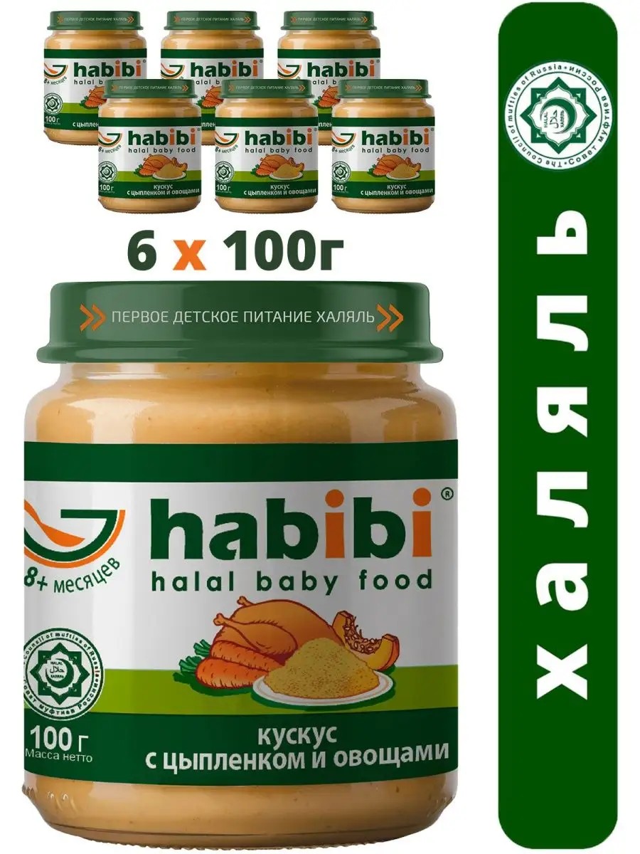 Вкусный и полезный комплексный обед для детского питания малышей с 6 месяцев. Детское мясное пюре с цыпленком и кускус Habibi - это уникальный продукт в линейке детского мясного пюре в баночках. Мясное пюре для детей с добавлением крупы кускус будет вкусным и полезным прикормом для малышей, ведь кускус относится к полезным диетическим продуктам. Первый прикорм ребенка мясом должен быть вкусным и сбалансированным, именно нежный цыпленок поможет малышу адаптироваться к здоровой и питательной еде, мясное пюре для детей имеет в составе большое количество медленных углеводов, которые ускоряют расщепление жиров и помогают лучше усвоить полезные вещества, содержащиеся в других продуктах. А обогащенную строительную для организма базу детского питания в баночках составляет именно кускус с овощами с высоким содержанием витаминов группы В, Е, РР, микро и макроэлементы, железо, медь, кальций, калий, марганец, натрий, фосфор, цинк, селен, антиоксиданты, органические кислоты, растительную клетчатку. Детское питание Хабиби имеет удобный формат небольших стеклянных баночек, которые удобно брать с собой. Рецепт детского мясного пюре цыпленок с кускус и овощами прост: при приготовлении не используется крахмал, консерванты, ГМО, ароматизаторы и загустители. Детское пюре Habibi Кускус с цыпленком и овощами содержит в своем составе глютен, обратите пожалуйста внимание. Купить детское пюре мясное с овощами– значит с заботой, любовью и вниманием создать для вашего малыша полноценный прием пищи для энергичного дня.