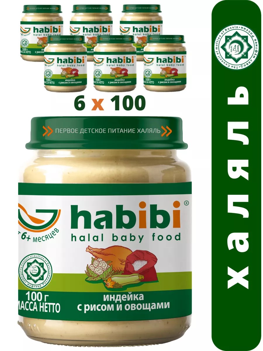 Вкусный мясной обед для малыша из нежной и сочной индейки с рисом и овощами позволит с удовольствием накормить вашего ребенка полезной и здоровой едой. Комплексный обед в каждой баночке детского пюре Habibi содержит нежное пюре индейки, молодой кабачок и цветную капусту и рис. Гипоаллергенное мясное пюре индейки содержит минимум жира и легко усваивается неокрепшей пищеварительной системой ребенка, а сочные ароматные овощи обогащены ценными витаминами и микроэлементами. Детское мясное пюре в баночках полностью усваивается, сохраняя энергию и хорошее настроение. В индейке содержится фосфор, магний и витамины A, D, D3, E, и конечно витамины группы В, а овощи дополняют ансамбль полезными микро и макроэлементами, тем самым детское питание полностью удовлетворяет потребности организма в полезных веществах для роста и развития. Детское питание Habibi является первым в России халяльным продуктом для малышей, мы строго соблюдаем все правила Халяль при изготовлении детского мясного пюре в баночках. При производстве нежного пюре индейки с овощами мы создаем здоровую еду для детского питания, которая не содержит соль, крахмал, консерванты и ГМО. Детское мясное пюре Хабиби удобно брать с собой с путешествия и на прогулку, чтобы малыш всегда мог получить вкусный обед, если проголодается. Купить мясное пюре для детского питания можно с запасом, так как срок хранения рассчитан на 24 месяца.