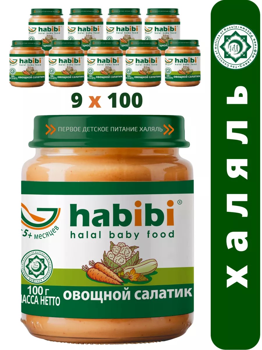 Вкусный и удивительно нежный овощной салатик из серии детского овощного пюре позволяет подарить малышу заряд бодрости и витаминов. Детское пюре из овощей рекомендовано для младенцев с 5 месяцев, в его состав входят молоденький кабачок, свежая, сладкая морковь и сочная капуста, а вместе они создают яркое вкусовое трио здоровой еды в каждой ложечке. Овощной салатик подходит для детского питания для первого прикорма и обогащения комплексного обеда ребенка витаминами и минералами. В хрустящей морковке в детском пюре в баночках даже после термической обработки сохраняются витамины А и С, крайне важные для роста, зрения и иммунитета малыша, капуста нормализует пищеварение, а кабачок насыщает организм ценными белками и углеводами. Сбалансированное питание для детей не содержит соль, крахмал, консерванты и ГМО. Детское овощное пюре для детей изготовлено из сырья Халяль. Habibi первые в России, кто изготавливает детское питание по правилам халяльных продуктов. Купить детское пюре Овощной салатик Хабиби– это обеспечить вашему малышу вкусный и полезный рацион питания в любой момент времени, ведь овощное пюре в баночках удобно брать с собой на прогулку или в поездки. Сытый ребенок – залог его гармоничного развития и хорошего настроения.