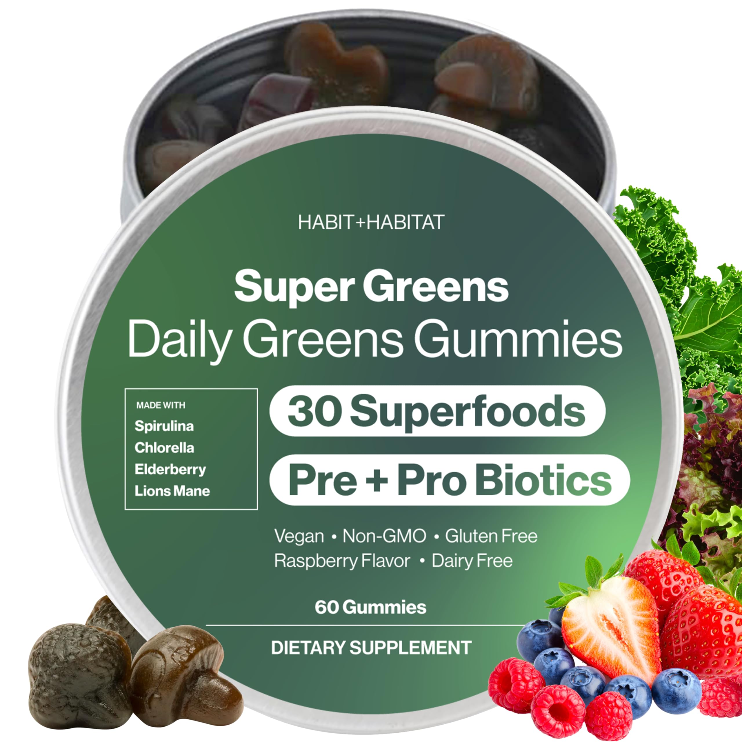 Habit + Habitat Daily Greens Plus Gummies - Superfood Blend with Chlorella, Spirulina, Beetroot, Lion s Mane, Ashwagandha & Reishi for Energy, Stress Relief & Wellness - Raspberry Flavored - 60 Count