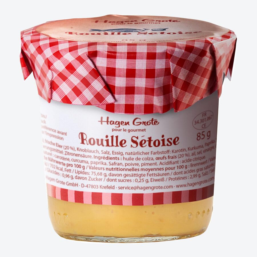 Hagen Grote's Rouille Sétoise is produced in its own delicatessen in the port city of Sète in the south of France, according to the original recipe. This is also where the famous Sétoise fish soup comes from, which goes perfectly with this mayonnaise made from rapeseed oil, fresh eggs, garlic, paprika, chili pepper and saffron. The savory and spicy taste of Rouille Sétoise, with its fine note of garlic and saffron, is ideal for fresh fish, seafood and fish soups. But also as a dip for vegetables or simply with fresh toasted bread. Made from purely natural ingredients, without colorings or preservatives, shelf life of at least 6 months. Exclusive Hagen Grote Ingredients : Rapeseed oil, fresh egg 20 , garlic, salt, vinegar. Colorings of natural origin: carotene, curcumin, paprika. Acidifier: citric acid, chili pepper, pepper and saffron. Net quantity: 85g Average nutritional values per 100 g 100 ml Energy value: 2886 kJ 702 kcal Lipids: 75.68g including saturated fatty acids: 5.75g Carbohydrates: 0.96g including sugars: 0.25g Proteins: 2.99g Salt : 1.14g Rouille 1 glass 85 gNo artificial colors or preservatives. Ideal with fish, fresh vegetables, or on a baguette. Complements the famous Sète fish soup. Delicious mayonnaise made with purely natural ingredients. Sète rouille based on the original recipe. La Rouille Sétoise de Hagen Grote est produite dans sa propre épicerie fine dans la ville portuaire de Sète, dans le sud de la France, selon la recette originale. C'est également de là que provient la célèbre soupe de poisson Sétoise, qui accompagne parfaitement cette mayonnaise à base d'huile de colza, d'œufs frais, d'ail, de paprika, de piment et de safran. Le goût savoureux et épicé de la Rouille Sétoise, avec sa fine note d'ail et de safran, est idéal pour les poissons frais, les fruits de mer et les soupes de poisson. Mais aussi comme trempette pour les légumes ou simplement avec du pain frais grillé. Fabriquée à partir d'ingrédients purement naturels, sans colorants ni conservateurs, durée de conservation d'au moins 6 mois. Exclusif Hagen Grote Ingrédients : Huile de colza, oeuf frais 20 , ail, sel, vinaigre. Colorants d'origine naturelle : carotène, curcumin, paprika. Acidifant : acide citrique, piment, poivre et safran. Quantité nette : 85 g Valeurs nutritionnelles moyennes pour 100 g 100 ml Valeur énergétique : 2886 kJ 702 kcal Lipides : 75,68 g dont acides gras saturés : 5,75 g Glucides : 0,96 g dont sucres : 0,25 g Protéines : 2,99 g Sel : 1,14 g Rouille 1 verre 85 gSans colorants ni conservateurs. Idéale avec du poisson, des légumes frais et sur une baguette. Complète la célèbre soupe de poisson sétoise. Délicieuse mayonnaise à base d'ingrédients purement naturels. Rouille Sétoise d'après la recette originale.
