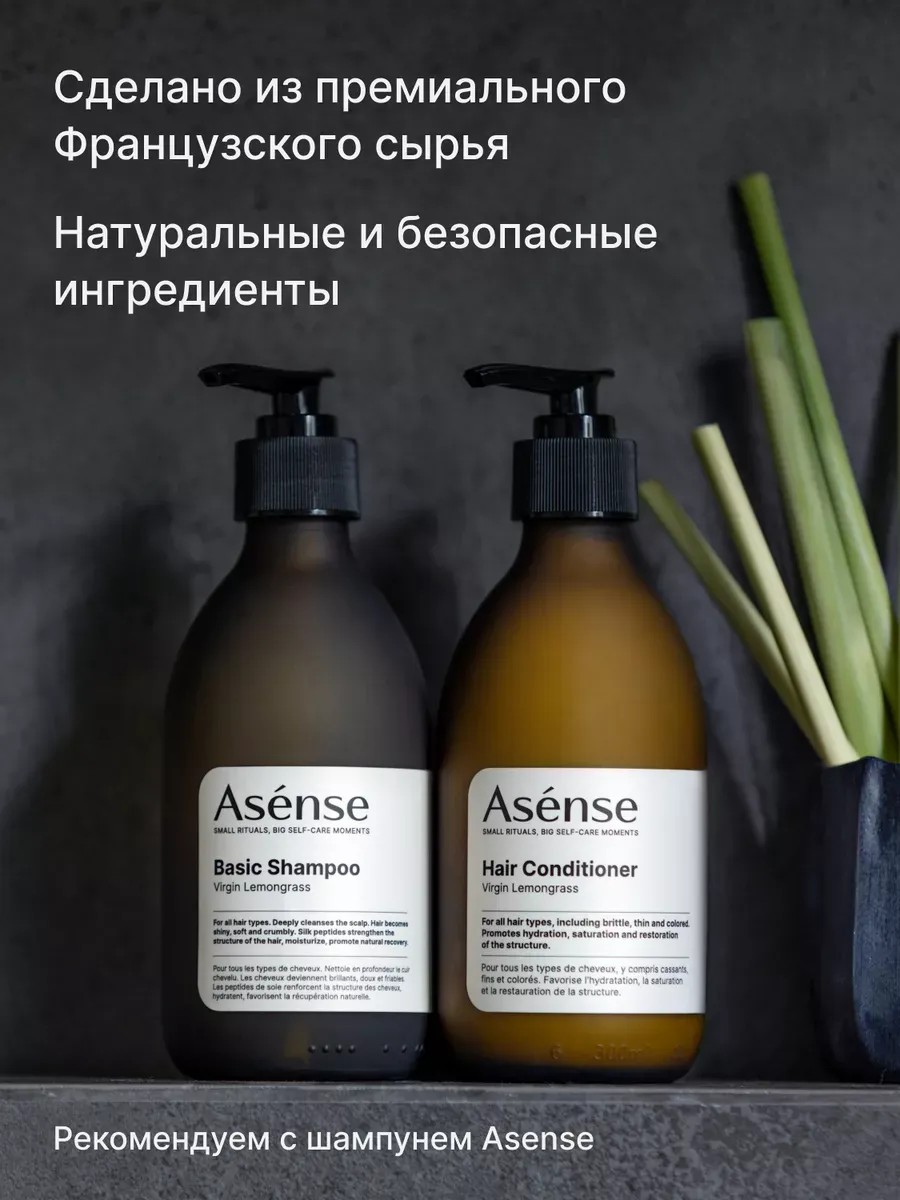Asense - perfumed cosmetics for home hair and body care. Conditioner for all hair types with a lemongrass scent is a unique product that not only moisturizes and nourishes hair but also adds shine and softness. Contains natural ingredients that help strengthen hair and protect it from damage, has a creamy texture and a delicate citrus aroma that will leave your hair smelling fresh and pleasant. French perfume Virgin Lemongrass. Citrus and herbal notes create a feeling of virginal purity. The combination of a delicate bouquet of lily of the valley, verbena, and jasmine enhances the aroma. Premium French raw materials used in production ensure the high quality and effectiveness of the conditioner and hair balm. Suitable for both women and men, it will become an indispensable assistant in your hair care. The composition does not contain artificial preservatives, sulfates, or other harmful substances. It is not tested on animals and does not contain animal products. This conditioner is suitable for all hair types, including color-treated, bleached, oily, normal, gray, curly, brittle, and fine hair, as well as sensitive scalps and hair treated with keratin. It moisturizes, nourishes, and restores structure. The sulfate-free conditioner's creamy texture allows for easy application and even distribution. Hair is easy to comb and becomes silky and shiny. It's the ideal choice for those seeking effective and safe hair care. Available in 250 and 300 ml sizes, it comes in frosted glass bottles with a dispenser. Directions for use are simple: apply the conditioner evenly over the entire length of your hair, starting from the roots. Leave it on for 2 minutes, then rinse thoroughly with water. For maximum results, we recommend using it with Asense shampoo.