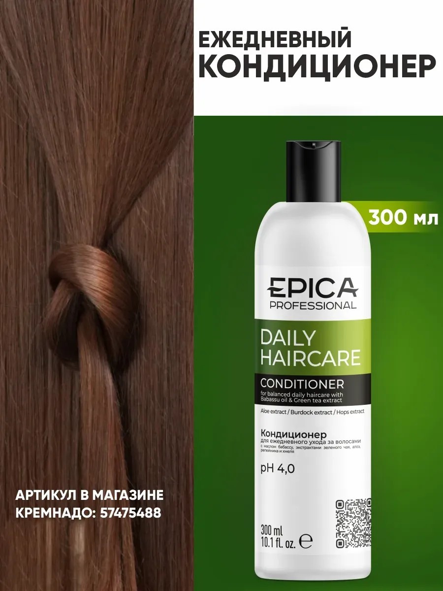 Кондиционер для ежедневного применения — идеальное решение для заботы о волосах. Кондиционер эпика разработан специально для частого использования, обеспечивая мягкое и эффективное действие. Кондиционер epica дает дополнительную защиту от УФ-лучей. Благодаря активным компонентам эпика professional интенсивно питает, освежает и тонизирует волосы. Экстракт алоэ ускоряет метаболические процессы, повышает эластичность прядей, стимулирует образование коллагена. Масло бабассу прекрасно впитывается в волосы, придает им упругость, облегчает укладку и укрепляет их от корней до кончиков. В результате волосы приобретают объем и густоту, перестают чрезмерно выпадать. Экстракт зеленого чая является также естественной защитой от вредного воздействия УФ-лучей. Зеленый чай укрепляет волосы, защищает их, усиливает рост, а также устраняет перхоть, зуд и предотвращает выпадение волос. Кондиционер идеально подходит для всех типов волос, обеспечивая им мягкость, эластичность и здоровый вид. Регулярное использование кондиционер для волос сделает ваши волосы мягкими, послушными и сияющими. Применение кондиционера очень простое: нанесите его на предварительно вымытые шампунем волосы, тщательно распределите по всей длине и оставьте на 2–3 минуты. Затем смойте водой. Не упустите возможность подарить своим волосам ежедневный уход и заботу с помощью кондиционера для ежедневного применения! Epica бальзам а идеален на подарок маме, подруге, любимой, коллеге на день рождения, 8 марта, Новый год, День Святого Валентина. Рекомендуем использовать в комплексе с профессиональной серией уходовой косметики для волос Epica / Эпика.