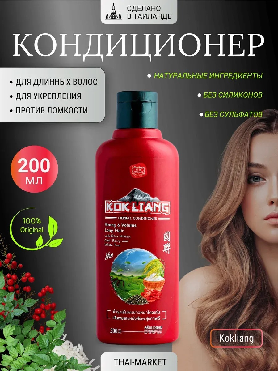 Тайский кондиционер предназначен против выпадения, для ухода за волосами как женский, так и мужской, независимо от их состояния и типа. Он является частью коллекции уходовой косметики, обеспечивая эффективный и восстанавливающий уход. Бальзам увлажняющий идеально подходит для окрашенных, вьющихся и кудрявых волос, возвращая им живой блеск. Тайская формула нацелена на насыщение влагой, что особенно полезно для сухих прядей, а также для жирных волос. Бессульфатный бальзам для объема волос становится безопасным выбором даже для чувствительных пользователей. Такая формула заботится о здоровье кожи головы и делает его подходящим для поврежденных волос. Этот тайский продукт поддерживает естественную красоту каждого локона, помогая добиться гладкости и шелковистости, работает от выпадения волос. Особенной чертой этого ополаскивателя является способность придавать объем тонким прядям, наполняя их энергией изнутри. Женщины высоко ценят его за качество увлажнения и восстановления структуры локонов после негативного воздействия окружающей среды или окрашивания. Натуральные ингредиенты без сульфатов способствуют улучшению состояния длинных волос, делая их более послушными и легко управляемыми. Эта тайская косметика обеспечит комплексный подход к решению разных задач: восстановление здоровья поврежденных участков, улучшение текстуры и предотвращение появления жирности у корней и для роста волос. Используя это средство регулярно, вы заметите мгновенные изменения — волосы станут более мягкими на ощупь и легко расчесываемыми. Тайские товары известны своим натуральным составом; кондиционер не исключение. Благодаря современным разработкам он обновляет структуру локонов по всей длине без утяжеления. Такой кондиционер будет полезен обладательницам сухих видов прически благодаря активному увлажнению каждого элемента. Используйте кондиционер для ежедневного ухода в паре с шампунем Kokliang и наслаждайтесь комплиментами вашей прическе!