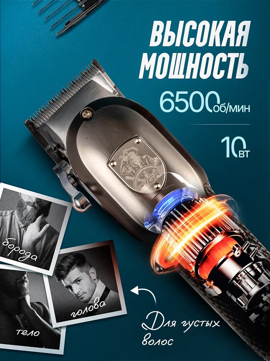 Introducing a professional hair and beard trimmer—the perfect tool for creating flawless hairstyles. Designed for both men and women, it handles thick hair and is perfect for experienced salon barbers and beginners alike. Its metal body ensures durability and strength. Internal components are protected from damage and environmental influences. Stainless steel blades are sharp and durable. A side lever allows you to adjust the cutting length. The trimmer is equipped with a powerful rotary motor and operates in both corded and corded modes. The display shows battery charge, power, and power status. This allows you to monitor the trimmer's progress and recharge it promptly. The trimmer comes with 6 comb attachments, which provide additional adjustment of the retractable blade. Trimmer maintenance oil and a cleaning brush are also included. Convenient storage is provided—a hanging loop is located at the base of the handle.