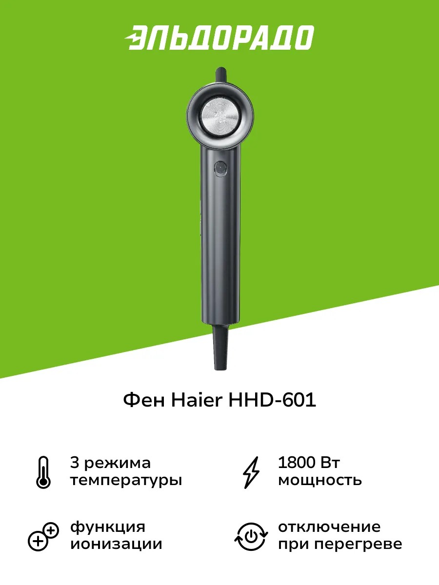The Haier HHD-601 hair dryer is a plastic-cased model with an EC motor that delivers air at speeds up to 65 m/s. Mechanical switches are located on the side of the handle. • Three speeds and three temperatures - nine modes Allow you to customize the optimal mode depending on your hair type and the task at hand. • Automatic shut-off Occurs in case of overheating. The 1800 W hair dryer is designed for daily styling and drying of curls. It is powered by a 220 V network. The device has a Euro plug for connection to an outlet. The cable length is 1.8 m.