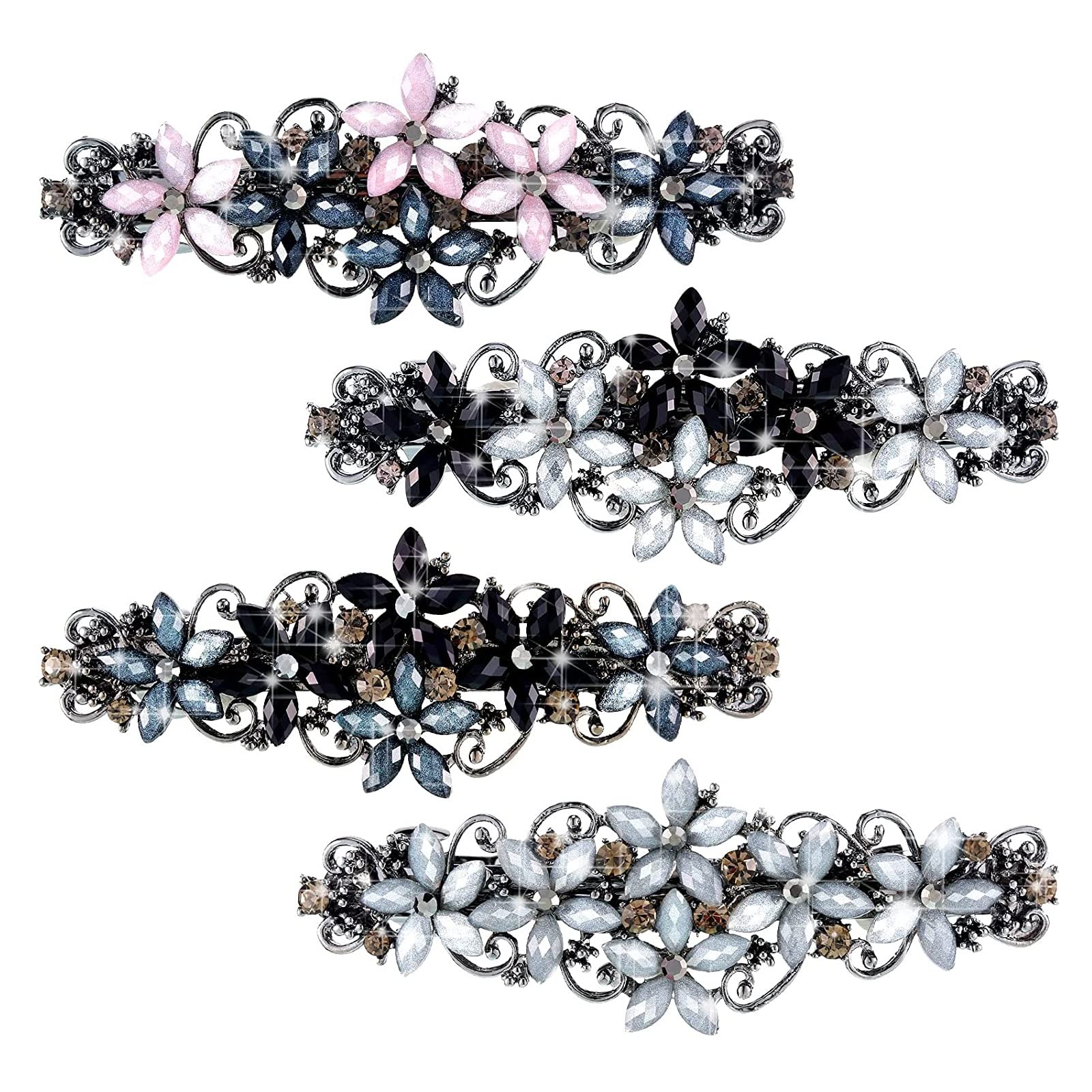Features: As delicate gifts: It is a nice choice for you to send these crystal rhinestones hair barrettes to your friends, sisters, mothers, wife, teachers and more on Teacher's Day, Valentine's Day and Christmas. Ladies vintage hair clip, not only has an elegant design but also has the all day holding power, can grip the hair all day. The surface of the hairpin is decorated with rhinestones and geometrically cut flowers, which shine like crystals after being artificially polished.The clip part is made of zinc alloy, with high hardness, wear resistant, not easy to deformation, non fading characteristics.Our Vintage Hair Clips are finely crafted to ensure no damage to the hair and scalp while providing a strong grip. Unique vintage style and fine workmanship, very suitable for wearing in daily life or unique occasions.The unique vintage style and fine workmanship are ideal for wearing in daily life or on special occasions, highlighting the noble and elegant temperament of women.Whether it is for self use or as a gift, it is an ideal choice. Bring you lots of convenience: The flower French clip is compact and lightweight, and you can put it in your handbags or even pockets, easy for you to store and carry, handy and portable. Specifications: Material: alloy, rhinestone and resin Color and size: as the pictures shown Total: 4 pieces Package includes: 4 x Crystal rhinestones hair barrettes Note: Manual measurement, please allow slight errors on size. The color may exist slight difference due to different screen displaysPackage included what you will receive is 4 pieces of crystal rhinestones hair barrettes with different styles in the package, meeting your daily wearing needs and replacement Sharing them with your good friends and sisters is also an ideal choice. Fitting to most: our retro elegant hair clips are suitable for some different hairstyles, such as thick, long, straight, curly and fine hair, easy to match your clothing and makeup as well. A wide range of applications These elegant styling hair clips suit for girls and women, suitable for wedding, party, ceremonies, birthday, banquet and daily wearing, gifts giving. Quality material adopted the flower French clip is made of alloy, rhinestone and resin The alloy and resin are not easy to rust, deform or break The rhinestone is inlaid tightly, not easy to fall out,These elegant hair clips are made of pretty rhinestone, faux crystal and metal alloy, very durable, sparkle and look very exquisite. Classic and retro style the vintage spring hair clip is decorated with some flowers and rhinestones, delicate and sophisticated, classic and vintage, glittering and appealing, adding to your charm and beauty.