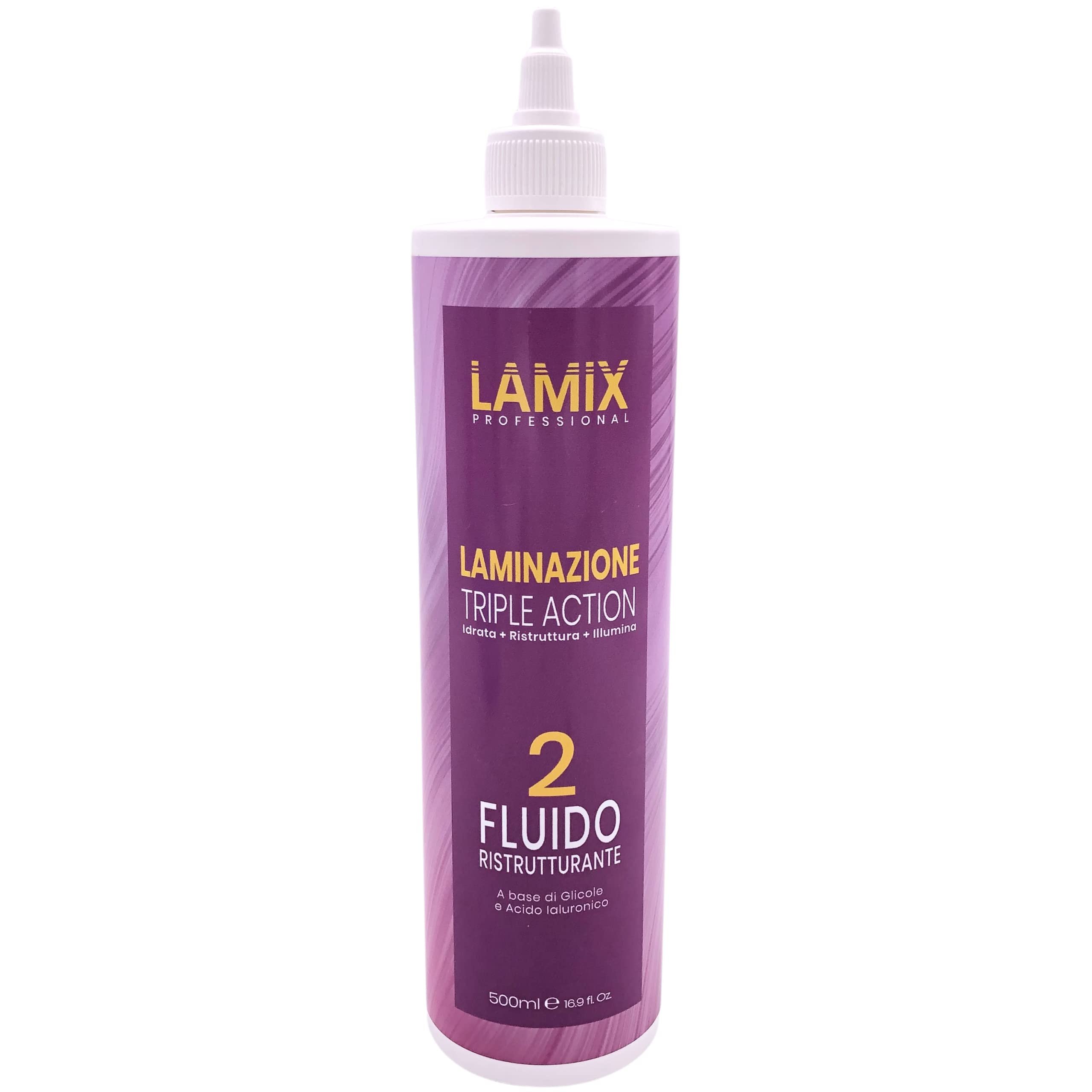 Intensive fluid for immediate revitalization of all hair types. The high concentration of hyaluronic acid, supported by the moisture of the glycol, fills the stressed areas and strengthens the hair fibers. Light, ultra-fluid texture, does not wear and gives back body and volume. Represents the second step of the professional LAMIX laminating treatment. The other steps that follow each time before and the liquid in the beauty routine are: 1 - moisturizing shampoo 1 lamix with keratin nourishes the hair in depth 500 ml 3 - light mask 3 lamix mirror effect 250 ml based on: hyaluronic acid component essential connective tissue with excellent anti-aging properties. Promotes the recovery of the amino acid chains of keratin, the main component of the hair structure. Its action immediately makes the hair denser, firmer and more elastic. Glycol helps the active ingredients in the formula penetrate deeply and immediately repair the hair fiber. It prevents water loss and helps retain moisture, while leaving the hair hydrated, vital and shiny for a long time. Use: distribute the liquid evenly on toweled hair from roots to ends. Depending on the length and density, use 20 to 40 ml. Massage and comb until completely absorbed, then continue rinsing. Size: 500 ml INGREDIENTS hyaluronic acid, glycol INSTRUCTIONS FOR USE On towel-dried hair, distribute the liquid evenly from roots to ends. Depending on the hair length and density, use 20 to 40 ml of the product. Massage and comb until completely absorbed, then continue rinsing. See moreLight and ultra-fluid texture, does not wear out and returns body and volume. The high concentration of hyaluronic acid is supported by the moisturizing power of glycol, which strengthens stressed areas and hair fibers. Intensive fluid for immediate revitalization of all hair types. [Complete restoration] The hyaluronic acid in combination with the glycol penetrates into the fibrous layer and binds to the hair structure and gives body and strength. [Hair Lamination] Lamix Triple Action is a professional lamination treatment in 3 steps (shampoo liquid mask), which aims to restore hair health and give it shine with extraordinary mirror reflections.Lamix Triple Action Haarlaminering van vloeistof, stimuleert en versterkt de haarvezel, geeft lichaam en volume aan elk haar, 500 ml Intensieve vloeistof voor onmiddellijke revitalisatie van alle haartypes. De hoge concentratie aan hyaluronzuur, ondersteund door de vochtigheid van de glycol, vult de belaste gebieden en versterkt de haarvezels. Lichte, ultra-vloeibare textuur, draagt niet op en geeft het haar lichaam en volume terug. Vertegenwoordigt de tweede stap van de professionele LAMIX lamineerbehandeling. De andere stappen die telkens voor en de vloeistof in de beauty-routine volgen, zijn: 1 - hydraterende shampoo 1 lamix met keratine voedt het haar in de diepte 500 ml 3 - lichtmasker 3 lamix spiegeleffect 250 ml op basis van: hyaluronzuur component essentieel bindweefsel met uitstekende anti-aging eigenschappen. Bevordert het herstel van de aminozurenkettingen van keratine, hoofdbestanddeel van de haarstructuur. Door zijn werking wordt het haar direct dichter, steviger en elastischer. Glycol helpt de werkzame stoffen in de formule diep in te dringen en de haarvezel onmiddellijk te repareren. Het gaat het waterverlies tegen en helpt vocht op te slaan, terwijl het haar lang gehydrateerd, vitaal en glanzend blijft. Gebruik: op handdoekjes haar verdeel je de vloeistof gelijkmatig van de aanzet tot in de punten. Gebruik afhankelijk van de lengte en dichtheid 20 tot 40 ml. Masseren en kammen tot het volledig is geabsorbeerd, ga dan verder met spoelen. Formaat: 500 ml INGREDIËNTEN hyaluronzuur, glycol GEBRUIKSAANWIJZING Op handdoekdroog haar de vloeistof gelijkmatig van de wortels tot in de punten verdelen. Gebruik afhankelijk van de haarlengte en dichtheid 20 tot 40 ml van het product. Masseer en kam tot het volledig is opgenomen, ga dan verder met spoelen. Meer bekijkenLichte en ultra-vloeibare textuur, slijt niet op en geeft lichaam en volume terug. De hoge concentratie aan hyaluronzuur ondersteunt door de bevochtigingskracht van glycol, die belaste plekken en haarvezels versterken. Intensieve vloeistof voor onmiddellijke revitalisatie van elk haartype. [Complete restauratie] Het hyaluronzuur in combinatie met de glycol dringt door tot in de vezelige laag en bindt zich aan de haarstructuur en geeft lichaam en kracht. [Haarlaminering] Lamix Triple Action is een professionele lamineerbehandeling in 3 stappen (shampoo vloeistof masker), die erop gericht is de gezondheid van het haar te herstellen en glans te geven met buitengewone spiegelreflecties.