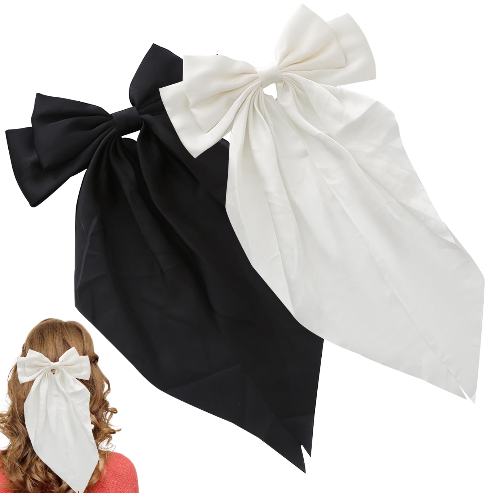 Description: Bow hair clips are made of satin fabric and metal french hair clips, with a glamorous, light, non-fading and long-lasting metallic finish coating is the perfect way to make your beautiful hairType charming and elegant. Our big bow hairpin can make you a delicate princess, making your hair charming and cute. It can also show French Type and become a gentle and elegant lady. The black and white bow hairpin is simple and fashionable, which is very suitable for daily wear. It can also be used as a hair ornament for wedding bridesmaids, parties, birthdays and anniversaries. It is also the perfect gift for relatives, family, friends and colleagues. The bow hairpin has a simple design, fashionable Type, and shows the natural beauty of your hair. In the shower, it also protects the hair from water damage. Bow tie spring barrette hairpin is easy to open and close, easy to use and not easy to fall out, keeping your hair neat and tidy all day. Features:. Hair Bows. -Color:black+white. -Material: Satin. -Size: about 18.7x20.5 cm/7.36x8.07 inch. Note: Manual measurement, please allow slight errors on size. The colors may exist slight difference due to different screens. Package Including 1 * Black Hair Bow 1 * White Hair BowSecure and Not Fall: Equipped with a sturdy claw clip, these bow claw clip ensures a firm and secure grip, keeping your hairType intact throughout the day without snagging or pulling on your hair. Silky Satin Material: Crafted from quality silky satin, these hair bows for women offer a elegant feel and a sleek, glossy appearance, providing a chic and polished look to elevate your hair styling. Ideal Gift: As a set of 2PCS in white and black color, these large hair bows make a thoughtful and stylish gift choice for friends, family, or anyone who appreciates chic hair accessories, adding a touch of glamour and charm to their hair styling collection. Wide Applications: Perfect for women and girls, these hair bows are a fashionable accessory suitable for daily wear, parties, weddings, or any event, effortlessly enhancing your hairType with a graceful and sophisticated flair. Elegant and Large French Bow Design: These big hair bows feature a sophisticated and sizable French bow Type, adding a touch of timeless elegance to any hairType, suitable for various occasions and hair types.