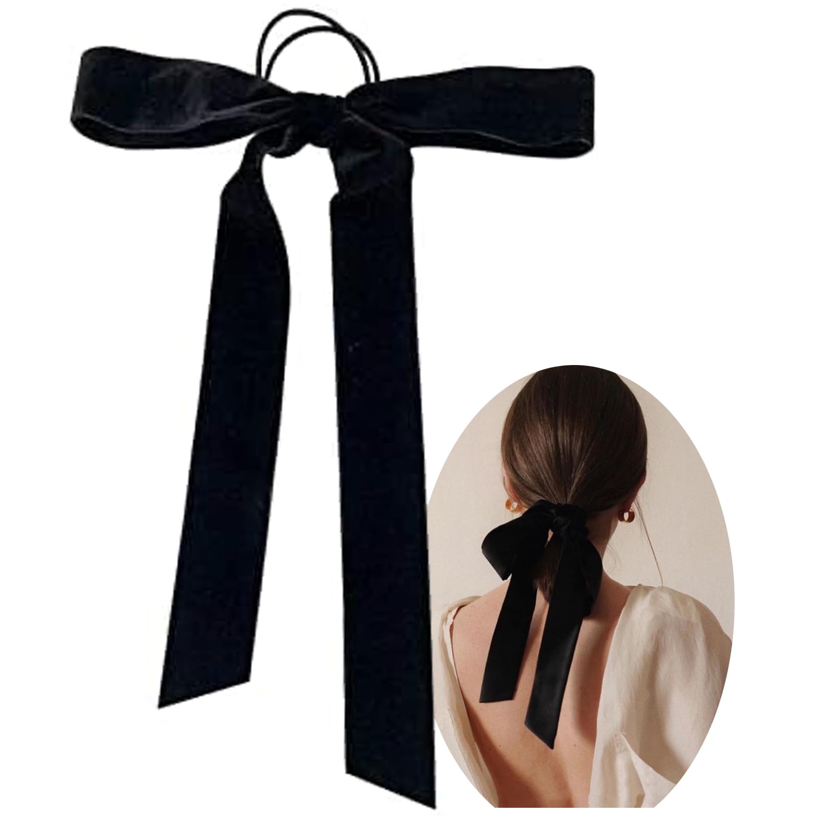 Features & Benefits: - Black bow with elasticated ponytail clip, cute and fashionable design makes it a perfect hair accessory for ladies. Ideal for school sports, competitions and photo shoots; Perfect for daily use and festive dress up, can be worn with school uniforms, dresses and Christmas dress up. - Made of high quality velvet material, good texture, shiny and comfortable to use. - Built-in elastic band has good stretch, not too tight or too loose, a perfect hair catcher. -Black colour can be matched with any outfit and occasion, make your hairstyle more attractive. . Name: Women's Hair Band Colour: Black Quantity: 1pc SAFETY WARNING NO?PERFECT GIFT?Bow Hair Rope can be used as a perfect gift for family and friends on birthday, Christmas, Valentine's Day, Mother's Day and other festivals. ?WIDE APPLICATION?Hair scrunchies are suitable for various occasions, such as parties, birthdays, anniversaries, art themed parties, proms, photo shoots, honeymoons, dates and so on. It can also be worn daily, perfectly match with any of your outfits. ?FASHIONABLE & CHARMING?Bow hair clips are made of elastic hair bands and bow headbands, the long ribbon bow end is very eye-catching and brightening, it is the best decoration for your beautiful hair. ?QUALITY MATERIALS?Bow hair bands are made of high quality materials, durable and elastic, it is a suitable hair accessory for women, it can fix your hair for a long time without pulling and hurting your hair, women hair clips are suitable for thick or fine hair. ?ELEGANT VELVET?This hair band with long ribbon is made of black velvet fabric, adding an elegant and silky touch to your hair. The smooth texture not only prevents hair breakage, but also ensures a comfortable and secure hold throughout the day.