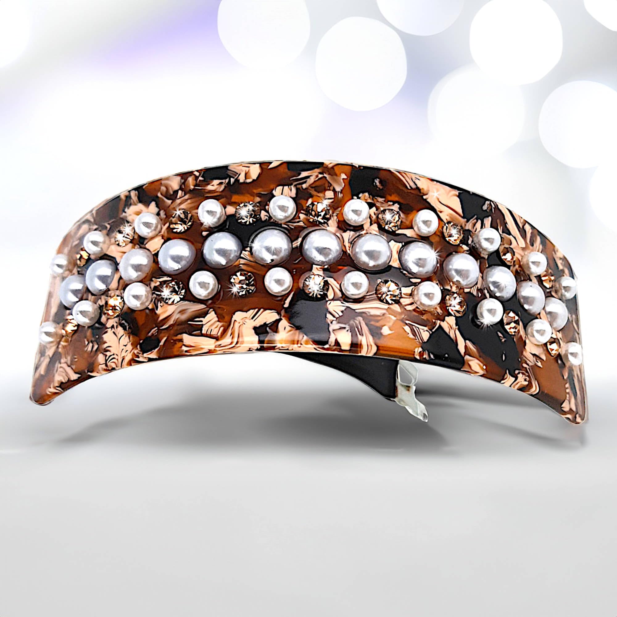 A selection of 4 colors: You will find hair clips in this option that harmonize with your outfits, your taste and hair color.A nice present.Optimal quality: Made from resistant materials (cellulose acetate and stainless steel) for a long service life, keeps the original luminosity and reflection.Hair clips for women without errors, with absolute robustness and infallible versatility.Practical and good: By attaching a chic hair knot or a loose ponytail with one click, the large, robust and light hair clip ensures a safe, comfortable hold, does not pull on the hair and does not damage your hair.For all hair types: The flexible double spring metal attachment system of the hair accessories adapts to the thickness of the paved hair and is therefore suitable for thick or thin hair.Beautify your hair: Personalize your appearance with this beautiful glittering hair clip with an exclusive design and graceful brown reflexes, finely decorated with freshwater pearls and AAA stone that give you character and elegance.Eine Auswahl von 4 Farben: Sie finden Haarspangen in dieser Auwahl, die mit Ihren Outfits, Ihrem Geschmack und Ihrer Haarfarbe harmonieren. Ein schönes Geschenk. Optimale Qualität: Hergestellt aus widerstandsfähigen Materialien (Zellulose-Acetat und Edelstahl) für eine lange Lebensdauer, behält die ursprüngliche Leuchtkraft und Reflexion. Haarspangen für Damen ohne Fehler, mit absoluter Robustheit und unfehlbarer vielseitiger Verwendbarkeit. Praktisch und gut: Durch das Befestigen eines schicken Haarknotens oder eines lockeren Pferdeschwanzes mit einem Klick sorgt die große, robuste und leichte Haarspange für einen sicheren, bequemen Halt, zieht nicht an den Haaren und schädigt Ihr Haar nicht. Für alle Haartypen: Das flexible Doppelfeder-Metallbefestigungssystem der Haar-Accessoires passt sich der Dicke der befestigten Haare an und ist daher für dickes oder dünnes Haar geeignet. Verschönern Sie Ihr Haar: Personalisieren Sie Ihr Aussehen mit dieser schönen glitzernden Haarspange mit exklusivem Design und anmutigen braunen Reflexen, fein verziert mit Süßwasserperlen und AAA-Strasssteinen, die Ihnen Charakter und Eleganz verleihen.Haarspange für Damen, Perle, Strass, braun, Haarklammer, Original, luxuriös, Haar-Accessoire, Zellulose-Acetat, Schildplatt-Motiv, abgerundetes Rechteck Marron