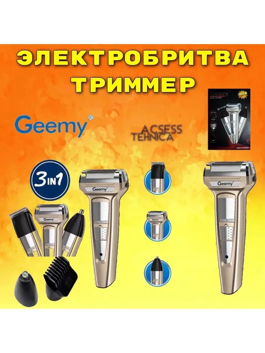 Машинка для стрижки/ Триммер для волос и бороды ПЕРВОЕ.......Электробритва GEEMY MARKA GM6582/ БРИТВА/ СТАЙЛЕР/ ТРИММЕР/ МАШИНКА ПРОФЕССИОНАЛЬНАЯ/ Многофункциональное устройство Geemy 3 в 1 представляет собой 3 полноценных инструмента для создания идеального внешнего вида для мужчины:• Электробритва двумя плавающими головками;• Триммер для носа и ушей;• Машинка для стрижки волос, бороды и усов с регулируемой насадкой;Ключевые особенности:• Лезвия из нержавеющей стали;• Полноценное зарядное устройство;• LED-индикатор;• Время работы 120 минут;• Время зарядки 8-12 часа;• Мощность 3 Вт;• Сухое и влажное бритье;• Самозатачивающиеся лезвия;• Беспроводное использование;• Эргономичная ручка для удобства использования;• Защитная крышка для чистоты бритвенной головки между сеансами бритья. ВТОРОЕ........................3 в 1, мужской триммер для бороды и волосТип изделия: Электробритва;Название бренда: Kemei;Размер: портативный;Материал: АБС + углеродистая сталь;Напряжение: 100-240 В;Время зарядки: 8 часов;Время работы: 60 минут;Мощность: 3 Вт;Характеристика-1: машина для бритья аккумулятора 1000 мАч;Особенность-2: с 1 направляющей расческой;;Особенность-3: безопасная режущая головка;Особенность-4: удобно работать;Особенность-5: Инструменты для укладки;3 точные лезвия для обрезки на различных участках для близкого, удобного и эффективного бритья.1 направляющая расческа;Обрежьте волосы и легко сделайте различные длины;Безопасная режущая головка;Особенности тесных обрезных головок, быстро и безболезненно захватывает и удаляет нежелательные волосы.Удобно работать;Вы можете заряжать встроенный источник питания и использовать в то же время, он также может быть использован без труда после зарядки.Отделка носа/ушей волос;Аккуратно перемещайте изделие, чтобы обрезать все нежелательные волосы в носу/ушахОбрежьте бороду;Медленно перемещайте бритву назад и вперед против растущего направления волос бороды, также можно побриться на шее таким образом;Обрежьте волосы;Отрежьте волосы до нужной длины, перемещая машинку обратно против потока волос1 x триммер для волос;3 x обрезная головка;Чистящая Щетка-1 шт.;1 x направляющая расческа;1 х USB кабель. ТОЛЬКО ОТ ALLIBOOM!