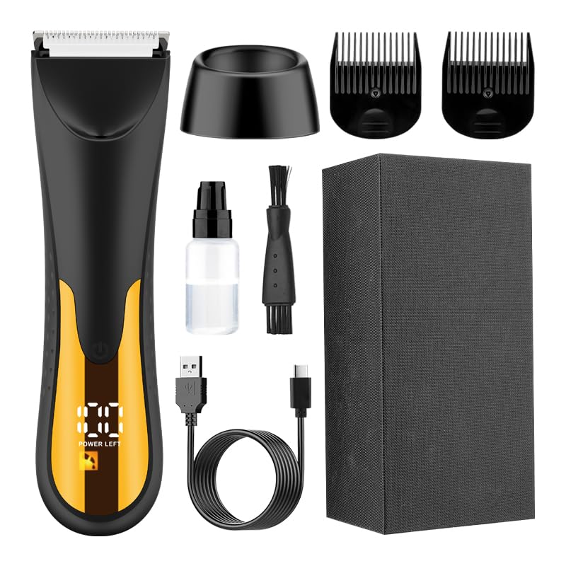 :Product Name: Body Hair TrimmerCharging time: 1.5 hoursUsage time: 90 minutesBattery capacity: 600mAhSpeed: 7000 rpmProduct features: LCD power display, full body waterproof, front LED photo light, with charging basePackaging:Shaving machine * 1Charging base * 1Limit comb * 2USB cable * 1Oil bottle * 1Brush * 1
