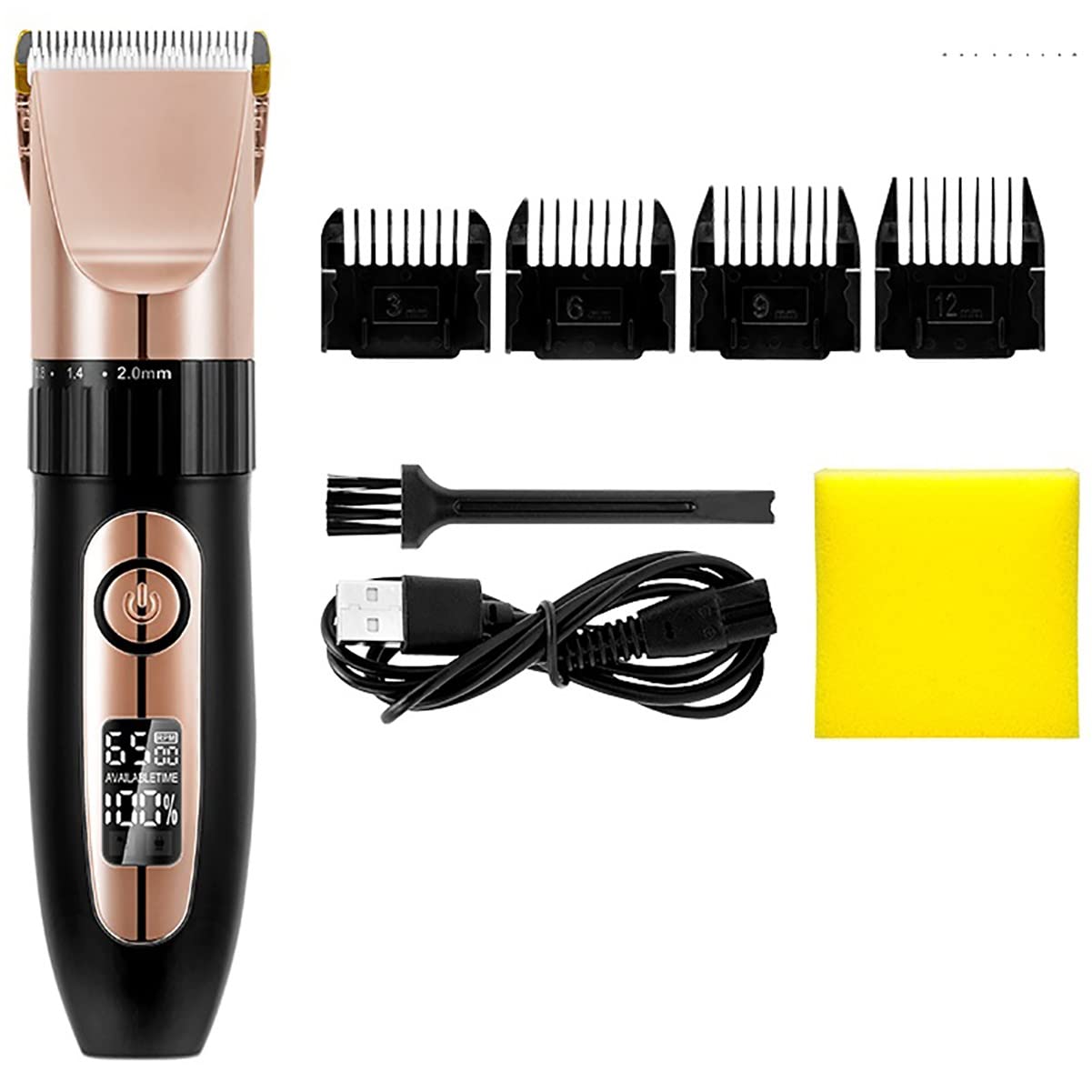 SpecificationMaterial: ABS + stainless steelVoltage: 110V-240V, 50-60HzFrequency: 50/60HzCharging time: 3 hoursUsing time: 120 minutesSize:18.5*4.5*2cmBattery capacity:1500mahRPM:6500/7000rpmLimit combs:3,6,9,12mmCutting Head Material: CeramicFeature1. Rechargeable or Plug-in To Use2. Rotation button for micro adjustment3. Rounded smooth edge that not easily damage your skin4. Slim creative cutting head well fitting skin and fast cutting your hair5. Sharp Titanium ceramic cutting head6. 7000rpm/min strong power7. Less than 55dB low noise8. Once charging can last up to 120-min working timePackage ListColor: Rose Gold,1 * Hair Trimmer4 * Limit Guide Combs1 * Brush1 * Sponge Cleaner1 * USB Cable1 X User Manual