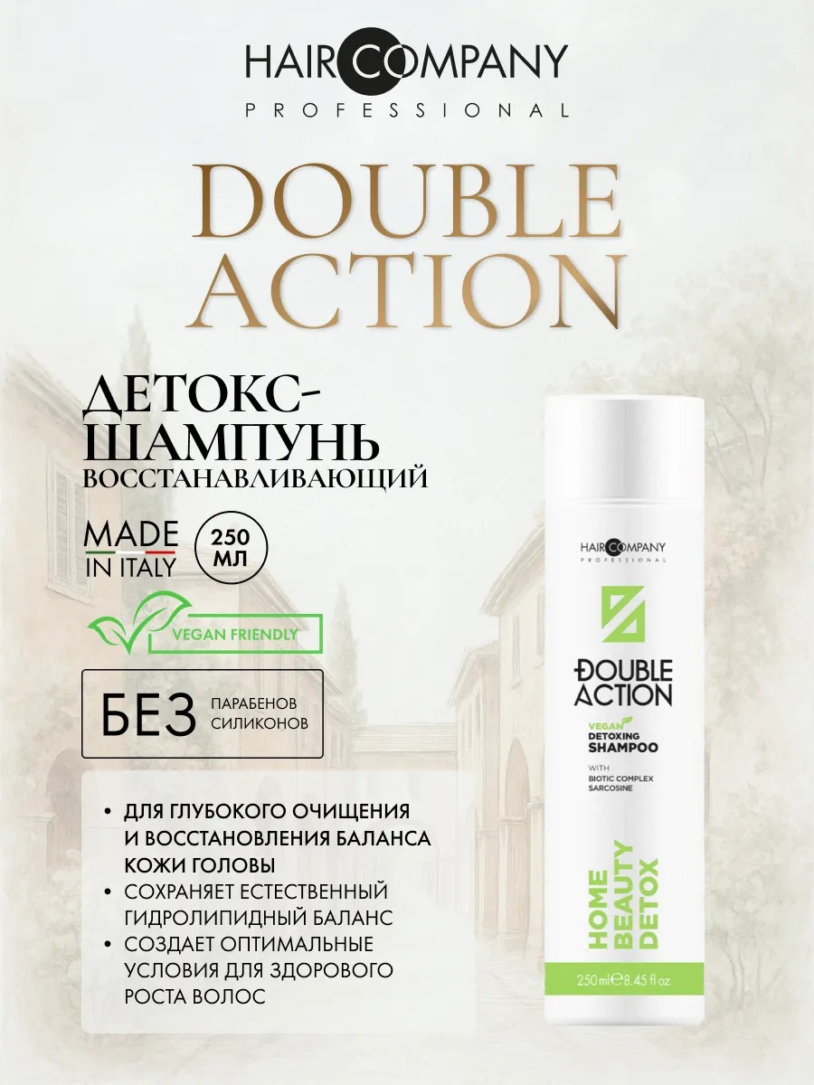 | Полное наименование товара | HAIR COMPANY Восстанавливающий шампунь ДЕТОКС для волос DOUBLE ACTION, 250 мл |