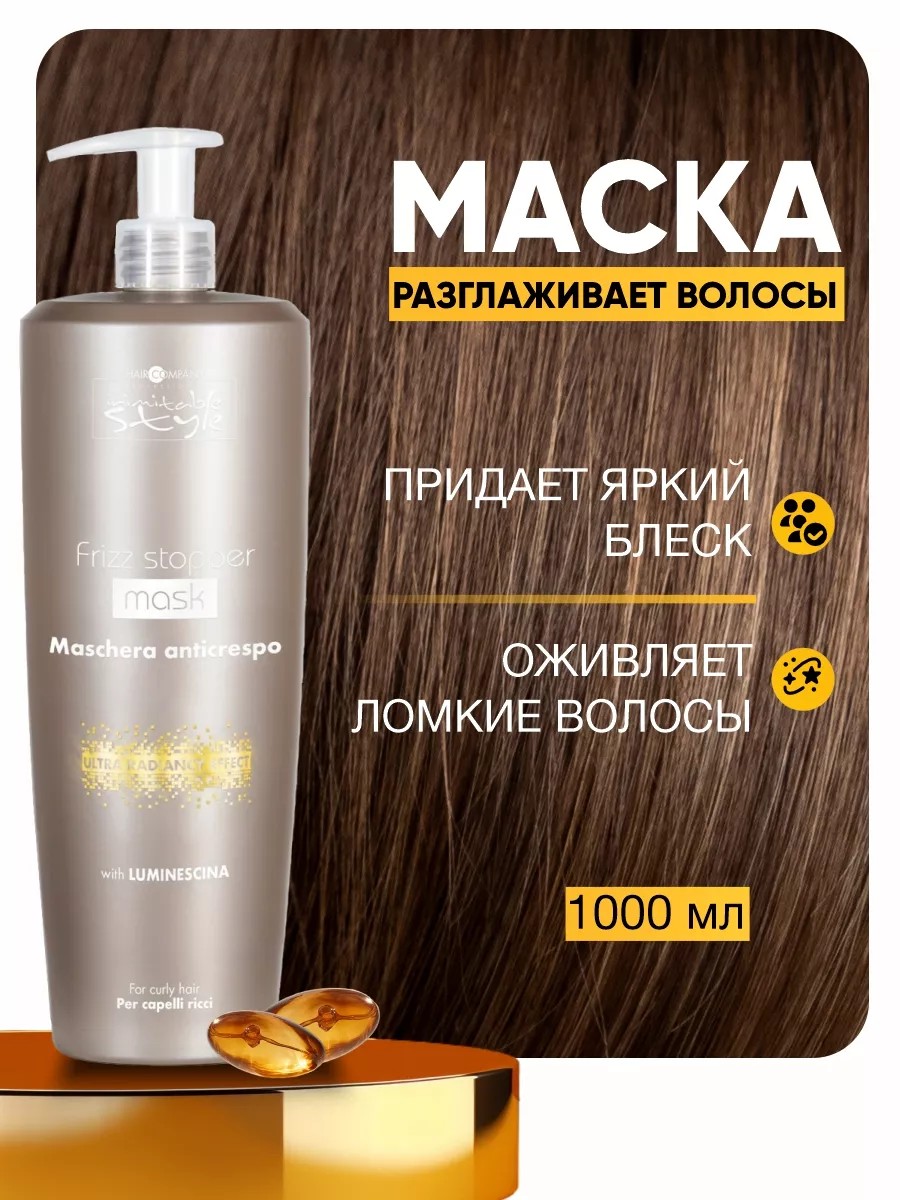 Маска профессиональная разглаживающая для волос, 1000 мл. Разработано для дисциплинирования волос. Помогает распутыть самые трудные волосы. pH 3,5. Применение. Нанесите на влажные волосы после промывания шампунем против пушения волос. Промокните волосы полотенцем, нанесите маску и равномерно распределите. Оставьте на 3-5 минут, затем смойте. Идеально на подарок для женщин - маме, подруге, любимой, коллеге на день рождения, 8 марта, Новый год, День Святого Валентина. Рекомендуем использовать в комплексе с профессиональной серией уходовой косметики для волос HAIR COMPANY PROFESSIONAL.