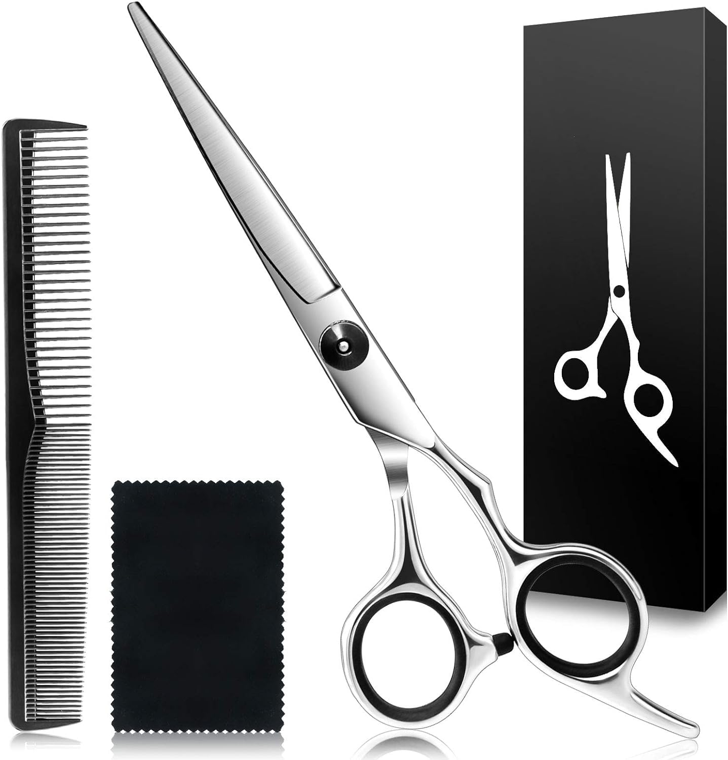 CUSTOMER SERVICE: We are confident that our hair cutting scissors are designed and made under strict quality standards to offer the best hair cutting shears and experience. If you are unsatisfied in any way with this product, please don't hesitate to contact us. We will be online 24 hours a day. DIY BEAUTY PRODUCTS GIFT: Our hairdressing scissors kit is great for the beginner, It is easily and conveniently achieve the perfect look.The hair cutting scissor and thinning scissor will meet what you all need DIY haircuts that suitable for professional barbers, children, adults, women, and men. A great gift of beauty products for any occasion. MULTIFUNCTIONAL CUTTING SCISSORS: This hairdressing scissors for your families and friends. Hairdressing Scissors 6.7 inches, Trimming shaping grooming thinning the hair, the professional hair thinning scissor safer and easier perfect for slicing wet or dry hair. Grade barber scissors are ideal for texturize hair for stylish looks. Ergonomic Design Premium Material Scissors:Our barber scissorsShock absorber at the end of the handle can effectively reduce wear and noise caused by handle collision Very ergonomic.Sharp and no hair caught between the blades. The adjustment of the hair shears screw allows you to easily tighten or loosen the shears as your wish. UPGRADE PROFESSIONAL COATING AND LATEST DESIGN: The hair cutting scissors are made with an upgrade Titanium Black Plated 440C Japan Stainless Steel, This hair cutting shears attributes to its glossy and shiny surface. Its professional coating prevents the steel from rust. Excellent performance which will not damage.