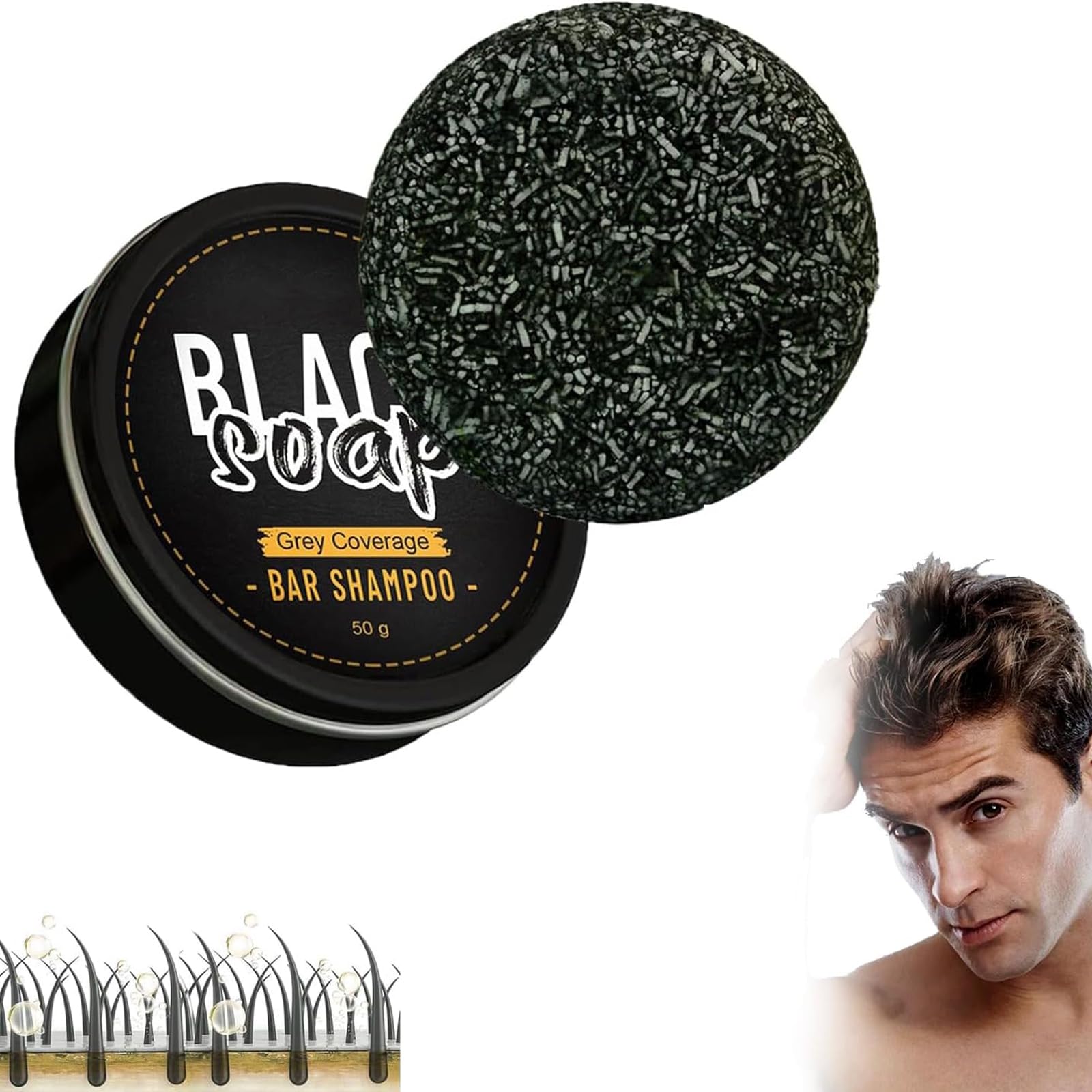 : With continued use, you can slowly restore your hair's natural color, from gray to deep, vibrant shades. Restore your confidence with the hair darkening shampoo bar and feel younger. Effective and Easy to Use: The shampoo bar effectively promotes blood circulation in the scalp and prevents hair loss, while keeping your scalp pores clean, eliminating dandruff, and making your hair healthier. Eco-Friendly and Space-Saving Hair Products: These solid gray-covering shampoo bars are eco-friendly and space-saving hair products that support environmental sustainability and are ideal for travel. Deeply cleanses hair and scalp, absorbs excess oil residue and debris, and thoroughly cleanses the scalp. With continued use, the gray hair reversal stick can effectively protect the scalp, moisturize the scalp, and repair damaged hair. Incorporate the gray reverse shampoo bar from the top of your head into your regular shower routine. This method effortlessly restores each strand of hair to its original color. Whether it's your head, beard, or eyebrows, the solid shampoo ensures a natural, gradual, and radiant result. Directions: 1. Wet your hair. 2. Rub the shampoo bar on your wet hair until a lather forms. 3. Gently massage your scalp with your fingertips. 4. Rinse thoroughly with warm water. 5. Repeat if necessary. 6. Allow the shampoo bar to air dry between uses.