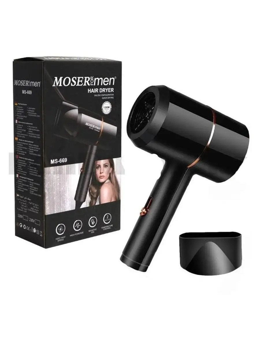 A lightweight, compact hair dryer with two speed and temperature settings. This model is easy to use, fits comfortably in the hand, and, of course, does its primary job perfectly – drying hair. Available in black with copper accents. With a power output of 1200W, this hair dryer is perfect for home use, travel, and takes up little space. It has a single control panel with two operating modes (first and second), as well as a warm/cold mode. Also included is a removable nozzle. Hair dryer, professional hair dryer, lightweight hair dryer, compact hair dryer, convenient hair dryer, travel hair dryer.