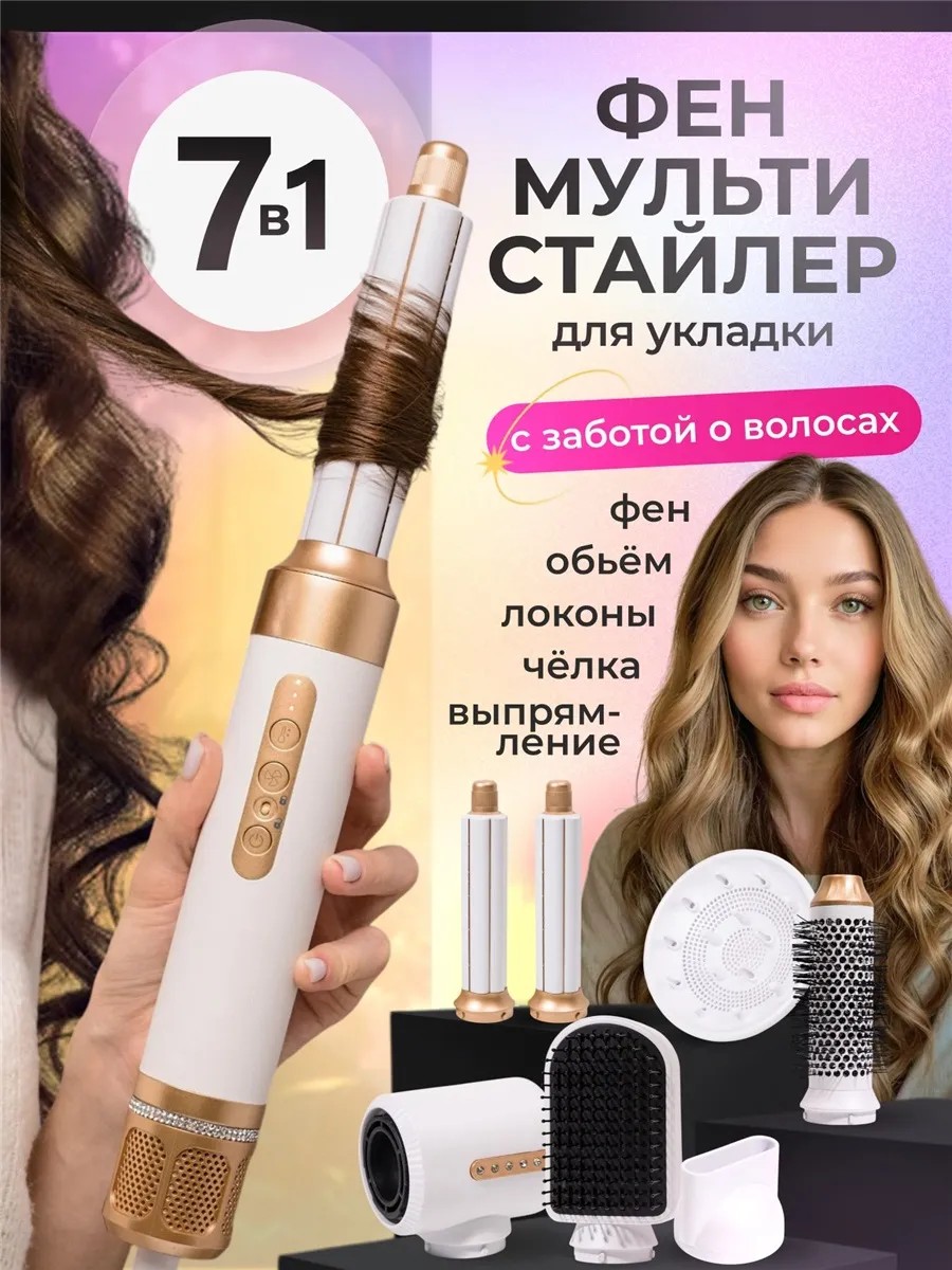 фен для укладки волос и электрические приборы 7-в-1: в его функции входят фен, щетка для горячего воздуха, выпрямитель для волос, автоматическая вращающаяся плойка, устройство для придания объема с помощью одноступенчатого стайлера, щетка для укладки и разглаживающая щетка, что позволяет быстро создать желаемую прическу и сэкономить время.