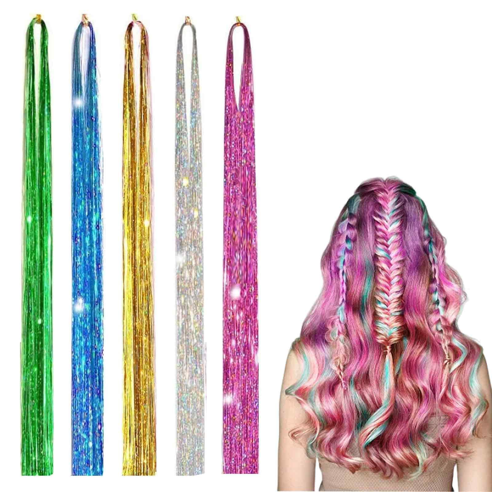 Feature: 1. The material of the tinsel is washable. Firm and durable,not easy to break and damage, and no chemical dyes will damage your hair. 2. This silver hair extension is about 47 inches/120 cm long, it is suitable for your trimmed length to better fit your own hair. 3. DIY any look you want. Adjustable to all the types of hair, easily cut these tinsel according to your need. 4. Ideal for all ages of girls. Can easily match your style, which can be matched with various makeup and clothing. 5. The shiny hair is suitable for daily hairdressing, birthday parties, theme parties. Make your beauty stand out. Specification: Material: High-quality PET thread Color: (Gold, Silver, Green, Pink, Blue) Length: 120cm (47 inch) Package List: 5 x hair strands Warming Notes: 1. Due to manual measurement, there may be a slight error in size. 2. Due to the light and screen difference, the item's color may be slightly different from the pictures.Please take the real one as standard. 3. It can even be dried and ironed (more than 180 degrees is not recommended). 4. If you are not satisfied with our for any reason, please contact us!?Good Props? Hair tinsel can replace hair dye, which is shorter and safer. They are great tools for hair extensions and braiding dreadlocks. You become the centre of attention, it can be worn by women of all ages. Perfect for Halloween, parties, fashion shows, weddings, everyday occasions, etc. ?Everyday Beauty? Perfect for girls who are unable to dye their hair and women who have some short-term needs. Making your cool and stylish hair tinsel with glittering strands. The glitter on your hair makes you unique. ?Easy To Use? Tie strands on your hair and hold it where you want it.The glitter hair tinsel is long enough, cut according to your hair lengthening needs. It can even be washed, dried and ironed. ?Hair Tinsel 5 Colors? Gold, Silver, Green, Pink, Blue. Can easy match your style, which can be matched with various makeup and clothing. Show you elegance and confidence. ?Fairy Hair Tinsel Kit Package? The length of each piece of hair is 120cm (47 inches) . Hair strands are made of high-quality laser PET filaments, which is safe and non-toxic. It can last on the head for weeks.
