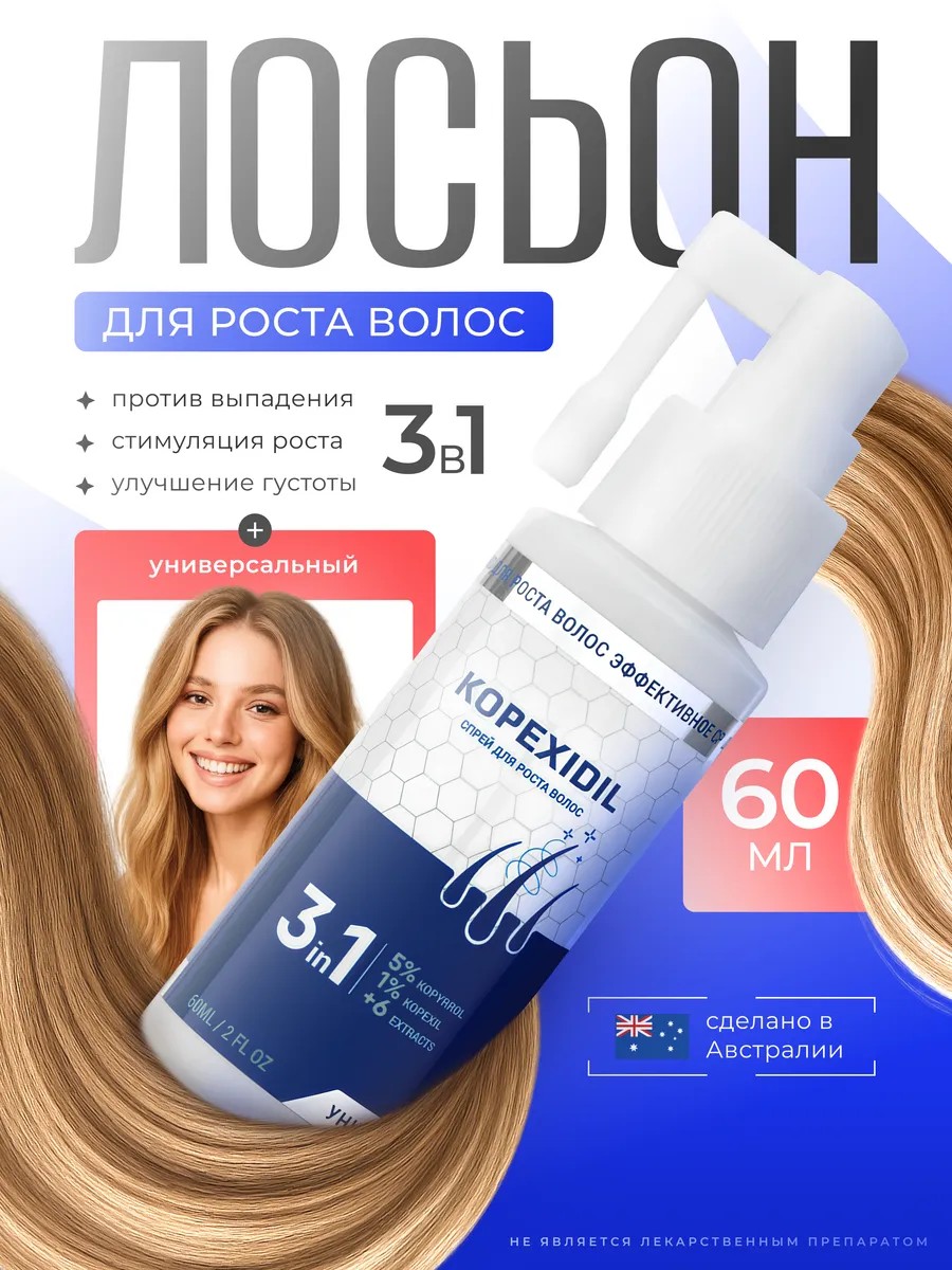 Лосьон (спрей) для роста волос 3-в-1 Kopexidil – это инновационное средство нового поколения для комплексного ухода за волосами.