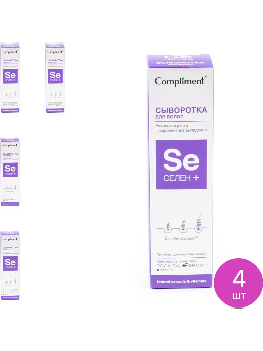 Compliment / Compliment Selenium+ Hair Serum, Growth Activator, Hair Loss Prevention, Scalp, Liquid, 150ml / for hair care. The set consists of 4 pcs. Price per set. Compliment Selenium+ hair growth serum offers gentle and professional hair care. Active ingredients deeply penetrate the hair follicle to restore the natural structure and vitality of hair, promoting strength and shine. Nourishing leave-in serum Compliment Selenium+ stimulates the production of keratin, necessary for normal growth and strengthening the internal structure of hair, making it strong, shiny, and elastic. The serum is based on the patented Baicapil complex; its active ingredients stimulate cellular metabolism of the scalp and promote tissue oxygenation. The complex helps normalize the life cycle of hair follicles, increasing the thickness and number of hairs in the growth stage, enhances metabolic processes, and restores structure. The natural component of the complex - baical skullcap extract - improves blood circulation to scalp cells, their tissue respiration and nutrition. The product facilitates combing, removes static electricity and creates reliable protection from negative environmental influences. Does not contain parabens, silicones and dyes. Volume - 150 ml. Ingredients: water, glycerin, d-panthenol, peg-40 hydrogenated castor oil, propanediol, arginine, lactic acid, glycine, soybean germ extract, triticum vulgare germ extract, baicalensis scale root extract, sodium benzoate, gluconolactone, calcium gluconate, hydrolyzed keratin, fragrance, phenoxyethanol, citric acid. Directions: Shake the bottle well. After washing your hair, dry it with a towel and spray the product evenly over the entire length of your hair from a distance of 15-20 cm. Comb with a massage brush and do not rinse.