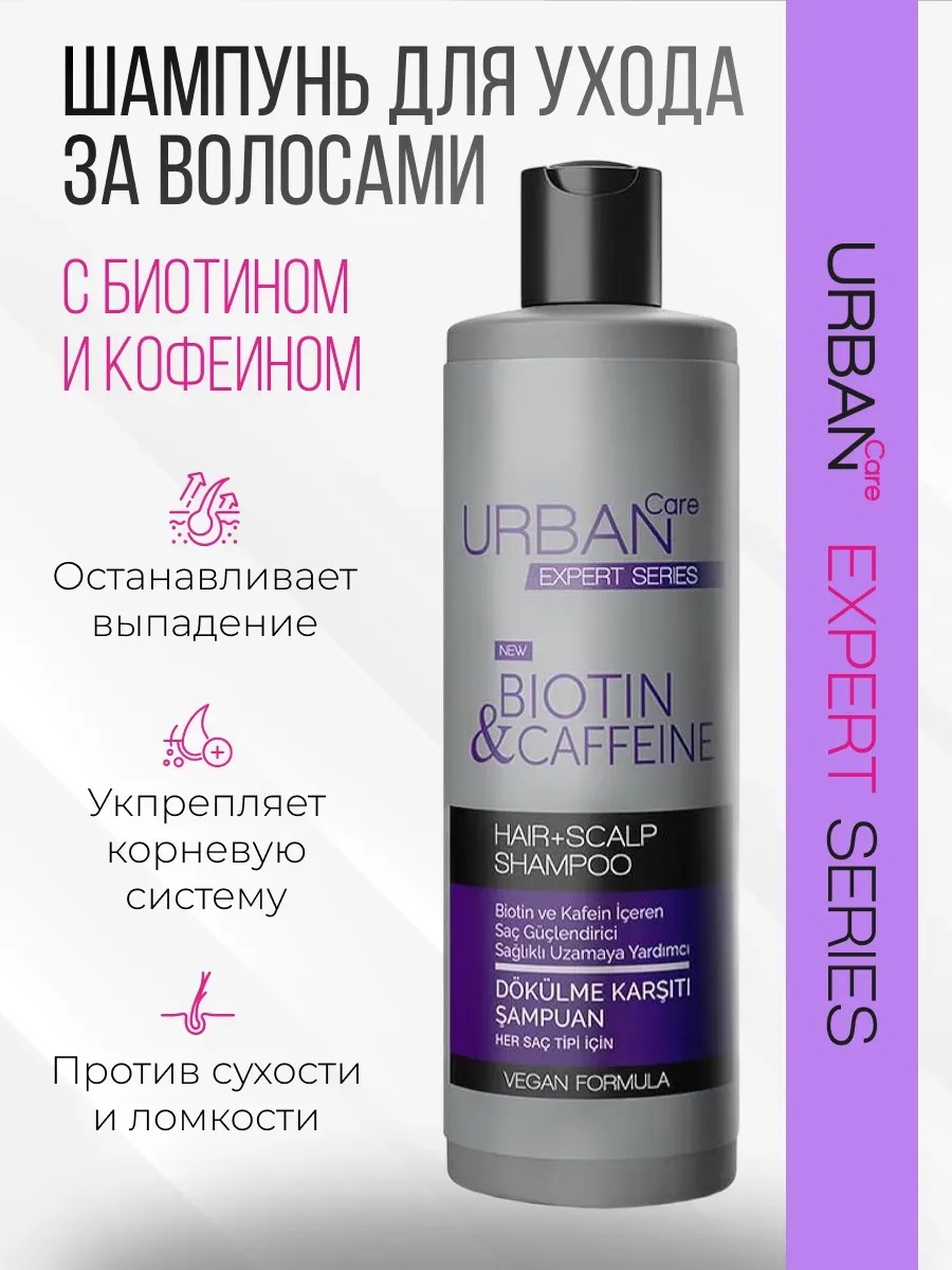 Urban Care Expert Shampoo with Biotin and Caffeine. Thanks to biotin and caffeine, this shampoo deeply cleanses hair roots prone to hair loss, stimulates hair follicles, and accelerates circulation, helping reduce hair loss and promote new hair growth. This original care product contains active ingredients that strengthen hair, reduce breakage and hair loss, and eliminate split ends. This gently cleansing, nourishing, and caring product for the scalp and hair makes your locks smoother, more elastic, and shinier, while healing them from the inside and out. This Turkish professional shampoo contains biotin, which nourishes the hair follicle and increases hair's natural resistance and longevity. The invigorating properties of caffeine are evident not only after a cup of aromatic coffee but also when used in skin and hair care products. The alkaloid caffeine stimulates blood circulation and tissue metabolism, strengthens and tones blood vessel walls, rejuvenates, and protects the skin from harmful environmental influences. When applied to the scalp, caffeine increases blood flow and energy directly to the hair follicle. This professional cleansing shampoo is suitable for all hair types.
