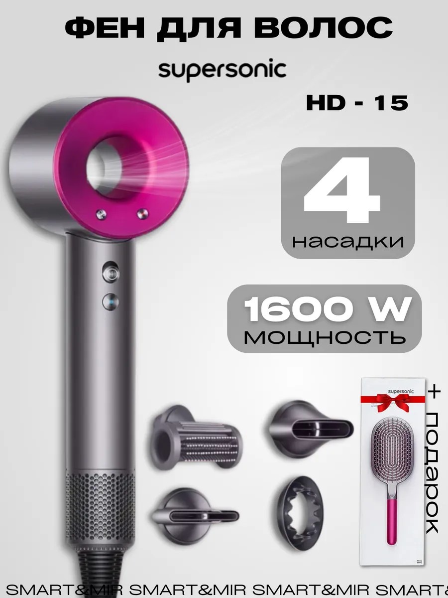 Фен для волос профессиональный Supersonic HD15, аналог дайсон. Фен производства МАЛАЙЗИЯ, оснащен цифровым мотором мощностью 1600 Вт. Имеет мощный бесшумный двигатель мощностью 1600w что позволяет быстро и качественно сделать укладку ваших волос и избежать повреждения волос и кожи головы. Сетевой кабель длиной 2.7 метра обеспечивает свободу передвижения.
