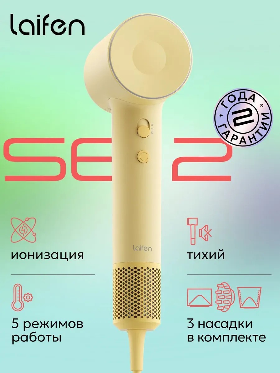 The Laifen SE 2 hair dryer provides gentle and effective drying thanks to its powerful design and modern construction. Its motor spins at 108,000 rpm, generating an airflow of up to 21.5 meters per second, significantly reducing drying time. A built-in intelligent temperature control system monitors and regulates airflow 80 times per second, preventing overheating and protecting hair from damage. The dryer features multiple temperature settings: cool air for setting your style, warm air (approximately 50°C) for gentle care, and hot air (approximately 85°C) for quick drying. Additionally, there is a temperature cycling mode that automatically switches the temperature for maximum hair protection, and a special children's mode with gentle temperature settings (38°C and 48°C), suitable for children's sensitive skin. The kit includes three attachments: a smooth nozzle for everyday drying and styling, a concentrator nozzle for precise airflow direction, and a diffuser nozzle for adding volume and natural curl shape. The body of the hair dryer is made of a durable combination of nylon and fiberglass, making the device lightweight (only 390 grams), ensuring comfortable use even with prolonged use. A convenient 2.5-meter cable allows for freedom of movement while drying. Laifen SE 2 is available in several colors: yellow, black, purple, and white. The noise level of the device does not exceed 59 dB, making it comfortable to use at any time of day. The warranty period is 2 years.