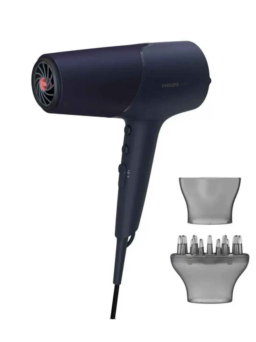 Hair dryer 5000 Series, with ThermoShield technology (to protect hair from overheating), 2300 W, 4x ionization*, 3 temperature settings / 2 speed settings. Concentrator nozzle 11 mm, Diffuser. Cord length 1.8 m. Color Blue / Metallic. The full-size Philips BHD510/03 hair dryer will help you create a beautiful hairstyle, just like in the salon. A powerful airflow dries hair quickly and makes styling easier. The device is equipped with ThermoShield technology to select the optimal temperature and protect against overdrying. Thanks to the ion generator, you get manageable, straight and shiny curls. The Philips BHD510/03 device with a stylish dark blue body and a comfortable handle is equipped with two attachments (diffuser, concentrator). A hanging loop makes it easy to store the hair dryer. This independently adjustable device features 2 speeds and 4 heat levels, including a cool shot to set your style. It also features reliable overheat protection.