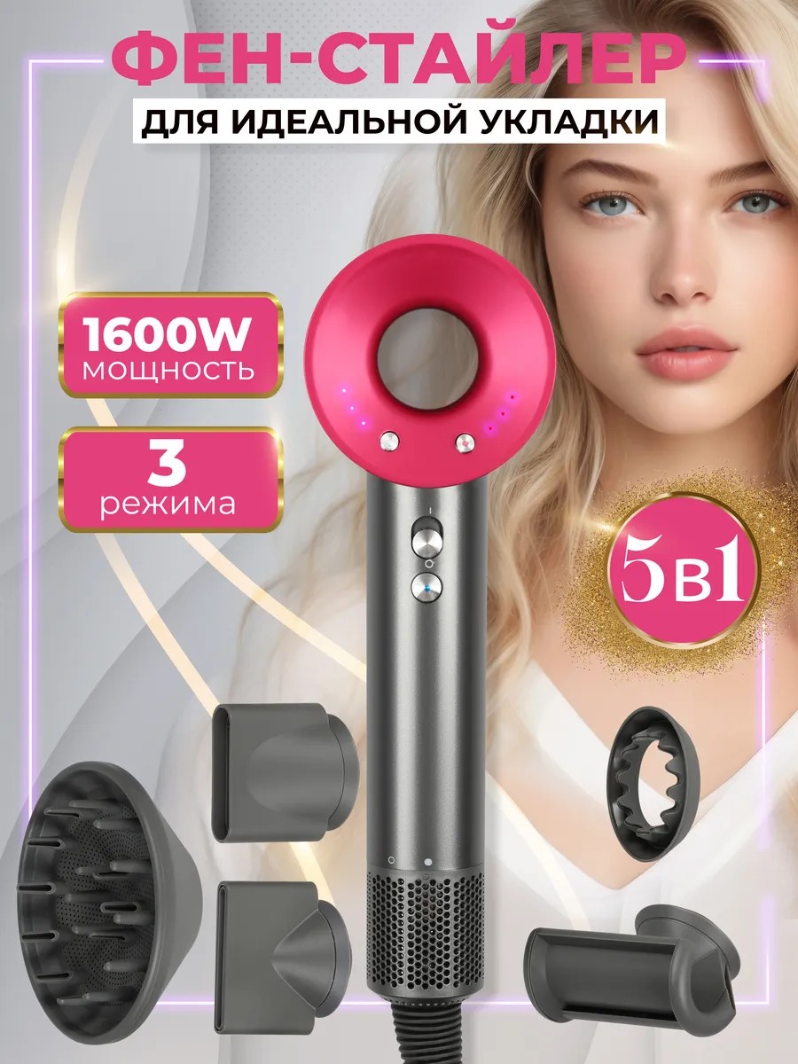 Мощный и стильный фен для волос 5 в 1 с пятью магнитными насадками — идеальное решение для укладки и создания объема. Этот профессиональный стайлер обеспечивает безопасную сушку и гладкость волос благодаря инновационной технологии ионизации воздушного потока. Уникальная функция снятия статического электричества устраняет пушистость, сохраняя естественную влагу в структуре прядей.