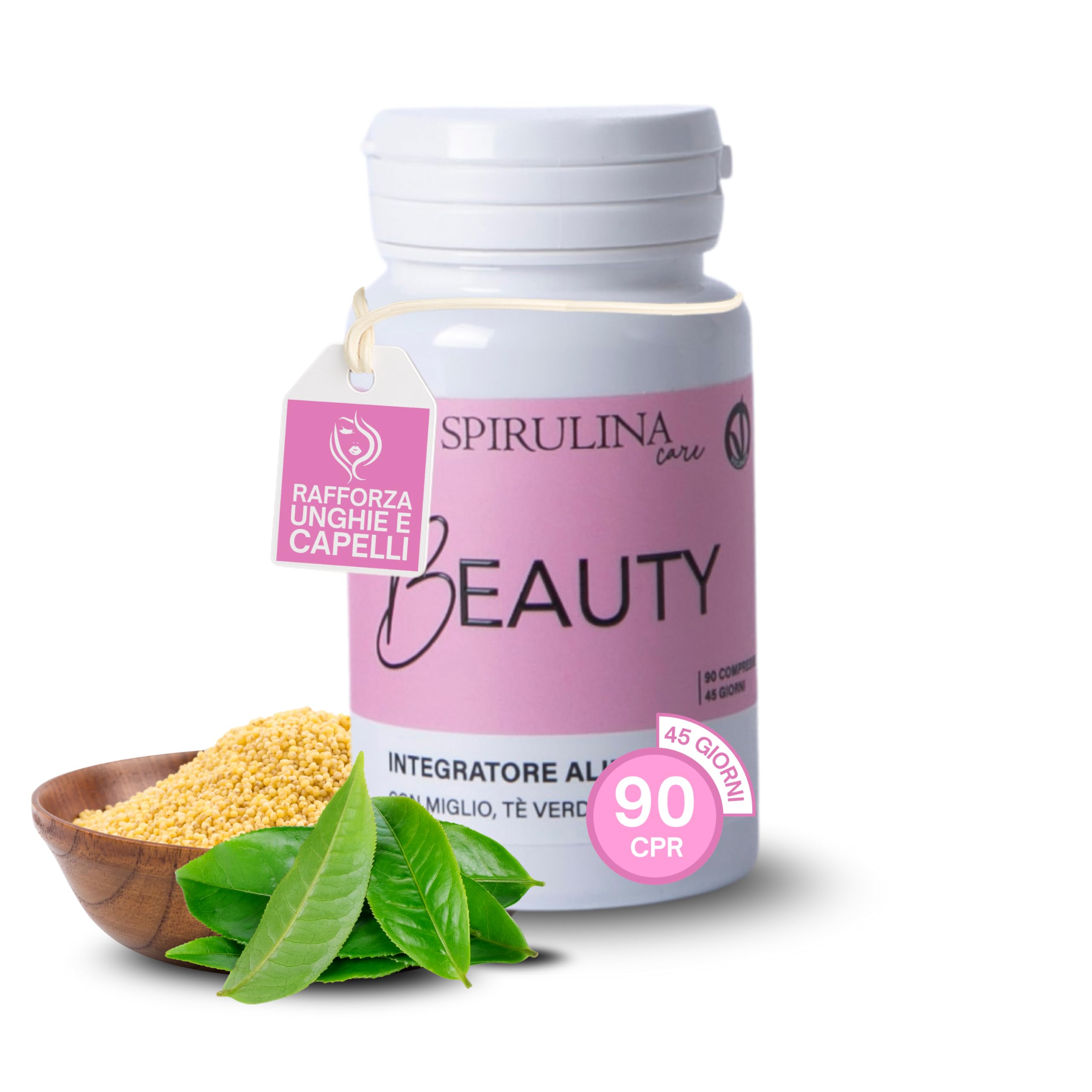 Beauty is the dietary supplement that transforms your approach to nail, hair, and skin care, offering targeted and natural support. Formulated with an exclusive selection of ingredients such as millet, green tea, spirulina, L-cystine, zinc, and vitamin E, this supplement is designed to combat the signs of weakening, restoring vitality and health to your skin tissues. The strength of millet, a plant traditionally used to strengthen hair and nails, is an irreplaceable ally in preventing flaking and loss. Combined with L-cystine, a key amino acid in keratin formation, millet ensures your hair and nails receive the support they need to withstand daily challenges. Green tea, with its high content of epigallocatechin gallate (EGCG), stands as a powerful protector against oxidative stress caused by environmental factors such as pollution and UV rays. This phytoextract, combined with vitamin E, works tirelessly to ensure firmer skin and more resilient tissues. The importance of zinc, present here in gluconate form, is equally significant. This essential mineral not only contributes to the maintenance of normal skin, nails, and hair, but also supports protein synthesis and enzyme function, essential for growth and preventing brittleness. Spirulina, an algae rich in protein, vitamins, and minerals, adds an extra layer of nutrients, helping your body overcome periods of stress and fatigue. Together with green tea, spirulina enhances the draining action and optimizes skin function, thanks to its supply of antioxidants and amino acids. Beauty is suitable for various dietary needs, thanks to its gluten-free and common allergen-free formula. Each pack contains 90 easy-to-swallow tablets, designed to be your daily beauty companion. With a dosage of two tablets per day, Beauty ensures the gradual and continuous absorption of its nutrients, progressively improving the health of your nails, hair, and skin. Investing in Beauty means choosing a natural, safe, and comprehensive solution. Thanks to quality ingredients and a balanced blend of essential substances, this supplement supports your well-being and helps you maintain a healthy, radiant, and well-groomed appearance every day. Incorporate Beauty into your daily routine and observe the positive changes it will bring to your life. INDICATIONS Store in a cool, dry place, away from light, and preferably at room temperature. The minimum shelf life refers to the product when properly stored in its original, unopened packaging. INGREDIENTS Millet (Panicum miliaceum L.) Fruits e.s. W D: 1 4 L-cystine bulking agent: cellulose spirulina algae (Spyruline platensis (Gomont) Geitler) tallo powder green tea (Camellia sinensis (L.) Kuntze) leaves, titrated to 40 epigallocatechin gallate (EGCG) zinc gluconate vitamin E (DL-alpha-tocopheryl acetate) anti-caking agents: magnesium salts of fatty acids, silicon dioxide. DIRECTIONS FOR USE It is recommended to take 1 tablet twice a day after main meals. SAFETY WARNING Do not use supplements as a substitute for a balanced diet and consult your doctor if you have any special conditions, such as pregnancy or breastfeeding. DISCLAIMER Do not take if you have allergies. Keep out of reach of children. See moreConvenient daily intake: 2 tablets per day, one after each main meal, for a gradual and optimal supply of nutrients. L-cystine, zinc, and vitamin E: strengthen hair and nails and contribute to healthy skin. Nourishing spirulina: rich in protein, vitamins, and minerals, it supports daily energy and vitality. Antioxidant green tea: protects the skin against damage from oxidative stress, pollution, and UV rays thanks to EGCG. Strengthening mile: prevents splitting and breakage of nails and hair by naturally supporting the keratin structure.Cheveux, Ongles et Peau – Mil, L-Cystine, Spiruline, Thé Vert, Zinc et Vitamine E – 90 comprimés à 600 mgDESCRIPTION DU PRODUIT DESCRIPTION DU PRODUIT Beauty est le complément alimentaire qui transforme votre approche du soin des ongles, des cheveux et de la peau, vous offrant un soutien ciblé et naturel. Formulé avec une sélection exclusive d'ingrédients tels que le millet, le thé vert, la spiruline, la L-cystine, le zinc et la vitamine E, ce complément est conçu pour lutter contre les signes d'affaiblissement, en restituant vitalité et santé à vos tissus cutanés. La force du millet, une plante traditionnellement utilisée pour renforcer les cheveux et les ongles, représente un allié irremplaçable dans la prévention de l'écaillage et de la chute. Intégré avec de la L-cystine, un acide aminé clé dans la formation de la kératine, le millet assure que vos cheveux et vos ongles reçoivent le soutien dont ils ont besoin pour résister aux défis quotidiens. Le thé vert, avec sa forte teneur en épigallocatéchine galate (EGCG), se tient comme un puissant protecteur contre le stress oxydatif causé par des facteurs environnementaux tels que la pollution et les rayons UV. Ce phytoextrait, associé à la vitamine E, travaille sans relâche pour assurer une peau plus tonique et des tissus plus résistants. Ce n'est pas moins l'importance du zinc, ici présente sous forme de gluconate. Ce minéral essentiel contribue non seulement au maintien de la peau, des ongles et des cheveux normaux, mais il soutient également la synthèse des protéines et le fonctionnement enzymatique, essentiels pour la croissance et la prévention de la fragilité. La spiruline, une algue riche en protéines, vitamines et minéraux, ajoute une couche supplémentaire de nutriment, aidant votre corps à surmonter les périodes de stress et de fatigue. Avec le thé vert, la spiruline renforce l'action drainante et optimise la fonction cutanée, grâce à son apport d'antioxydants et d'acides aminés. Beauty est adapté à différents besoins alimentaires, grâce à sa formulation sans gluten et allergènes communs. Chaque paquet contient 90 comprimés, faciles à avaler, destinés à être votre co