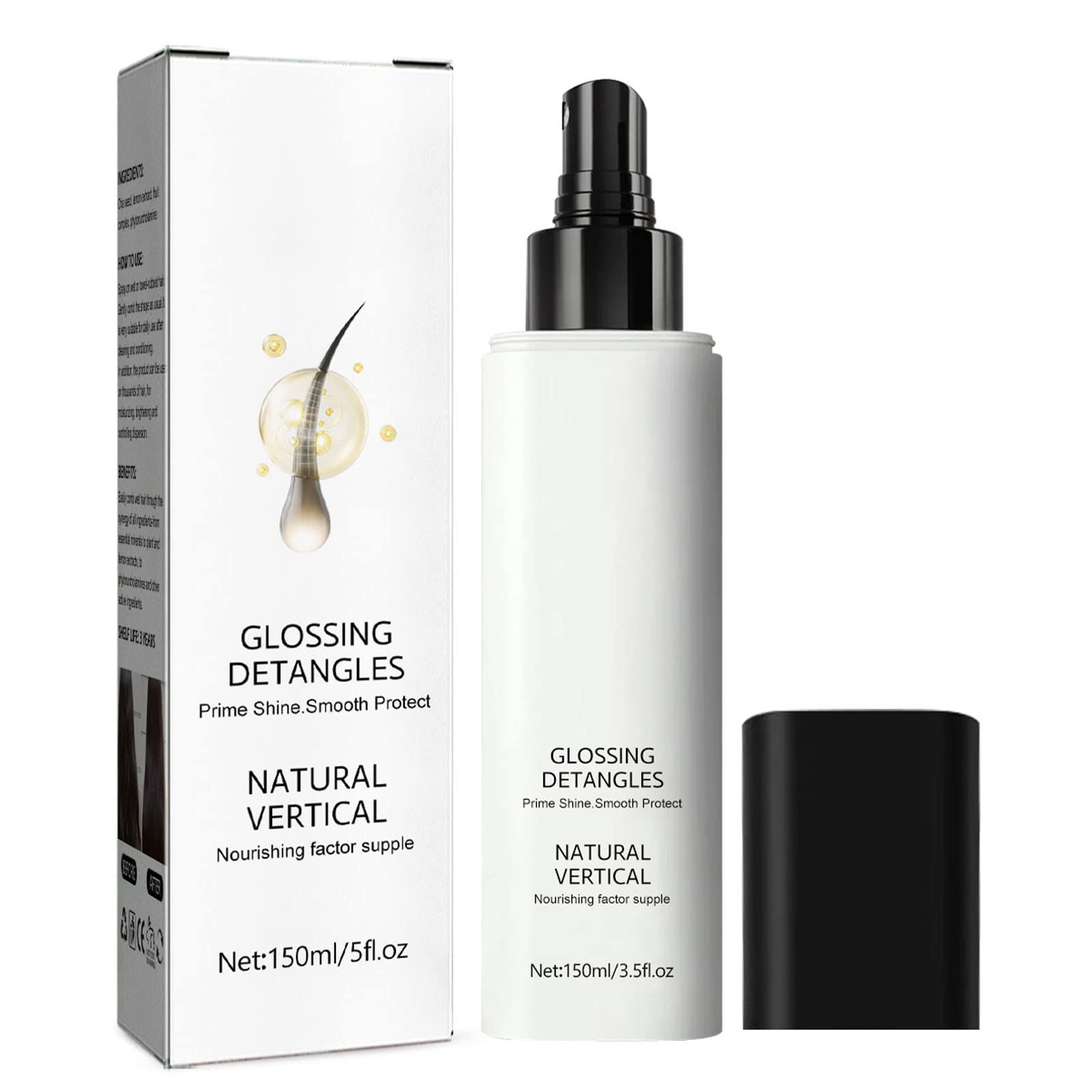 FEATURES A multitasking, lightweight spray that helps detangle. 99% Naturally-derived. Suitable for all hair types. Anhydrous formula. Prevents hair damage. HOW TO USE Spray on wet or towel-dried hair. Comb through gently and style as usual. Perfect for daily use after cleansing and conditioning. Additionally, product may be used delicately on dry hair for hydration, shine, and flyaway control. PACKAGE INCLUDED: 1/2/3/5 Bottles Hair Glossing Detangler Spray