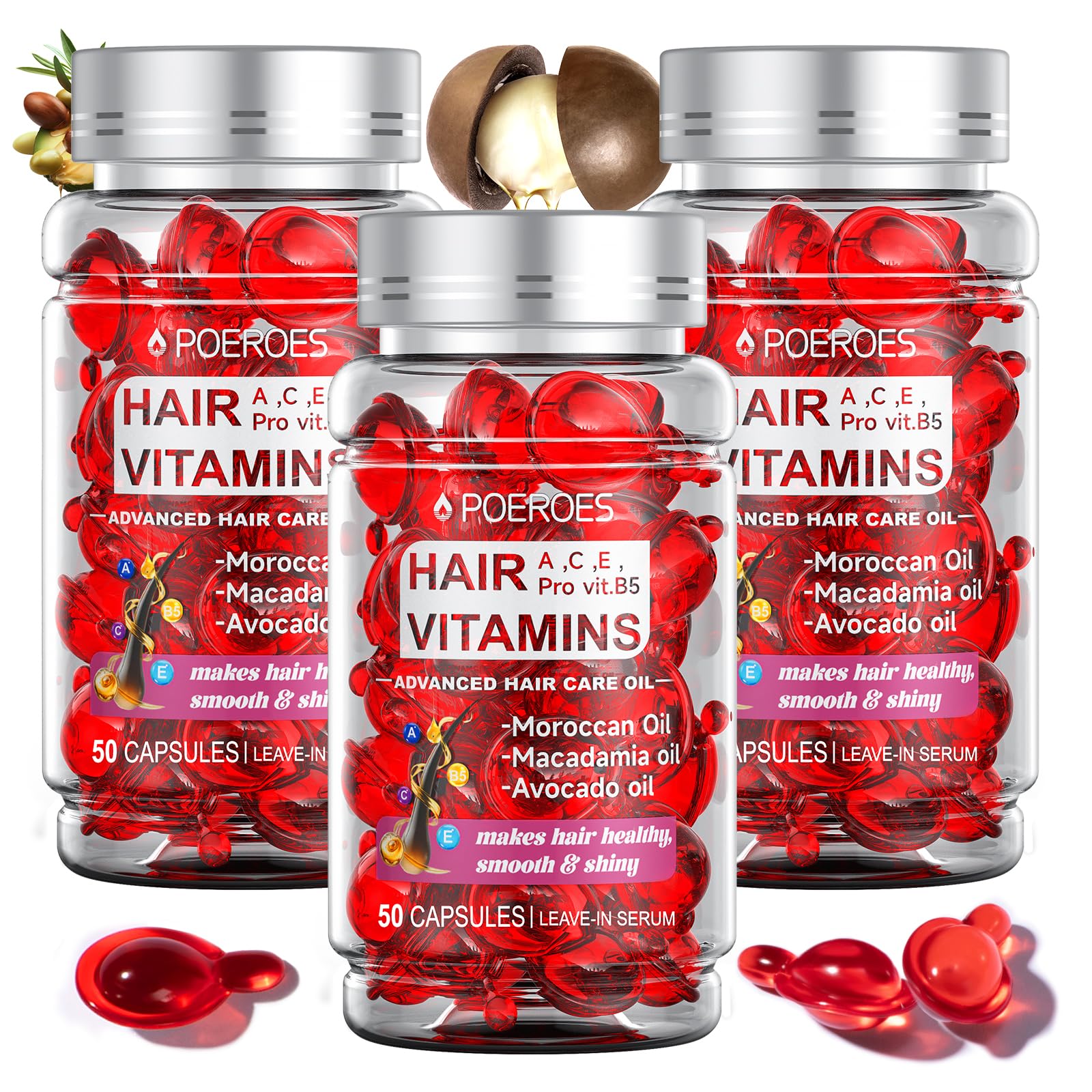 Transform your hair care routine with our Poeroes Hair Vitamins Capsules. Say goodbye to dull and lifeless hair with our potent Hair Treatment Serum Capsules, designed to strengthen and revitalize your locks for a vibrant and voluminous look. Our Hair Vitamins Oil Capsules are enriched with essential nutrients , providing deep hydration and repairing damaged hair from within. Experience the power of hair Oil in convenient capsule form with our Hair Vitamin Capsules, specially formulated to promote healthy and lustrous hair. Revitalize and nourish your hair with our Hair Serum Capsules infused with Argan, Avocado & Macadamia Oils, and a blend of Vitamins A, C, E & B5.
