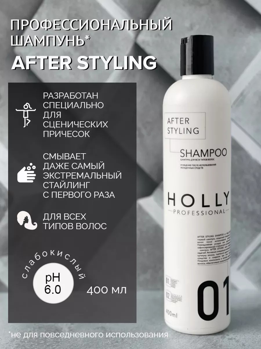 Holly Professional's AFTER STYLING Shampoo is the first shampoo created specifically for gently cleansing hair after styling. We produce a professional extreme hold styling gel (item 39409229) designed specifically for stage hairstyles. Our goal was to create a cleansing shampoo that would help dancers and athletes remove large amounts of gel, mousse, foam, liquid hairspray, and other styling products the first time without damaging the hair. A high concentration of active cleansing ingredients opens the cuticle, thoroughly washing away dirt and styling residue. The formula is enriched with natural, beneficial moisturizing ingredients for care, restoration, and treatment. Glycerin protects against breakage, dandruff, hair loss, and split ends. Panthenol adds density, volume, thickness, strength, beauty, shine, and elasticity, making combing easier along the entire length. Betaine normalizes the moisture balance of the sensitive scalp. Lactic acid nourishes, moisturizes, and softens hair, making it more manageable. Vitamin E stimulates cell renewal and oxygen circulation, as well as promotes growth. Our cosmetics are suitable for all hair types. We recommend using a conditioner, rinse, mask, or leave-in cream after washing. The light, liquid consistency easily forms a lather, rinses easily with water, and has a pleasant, perfumed scent. Suitable for women's, men's, children's, and teenage hairstyles, as well as for cleansing mustaches and beards. This is not a deep-cleansing shampoo; it has a balanced, slightly acidic pH of 6.0. The convenient 400 ml bottle includes two directions for use: for everyday use and for stage hairstyles. Does not contain mineral oils, parabens, SLS, keratin, aloe vera, collagen, hyaluronic acid, extracts, or salicylic acid.